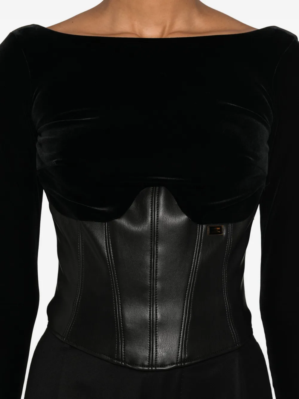 Черная бархатная панель с эффектом кожи, вставка в корсете, длинные рукава, вырез-лодочка, глубокий вырез сзади, застежка-молния на спине.