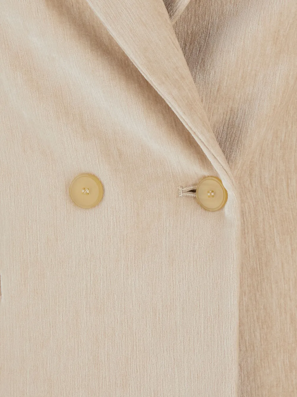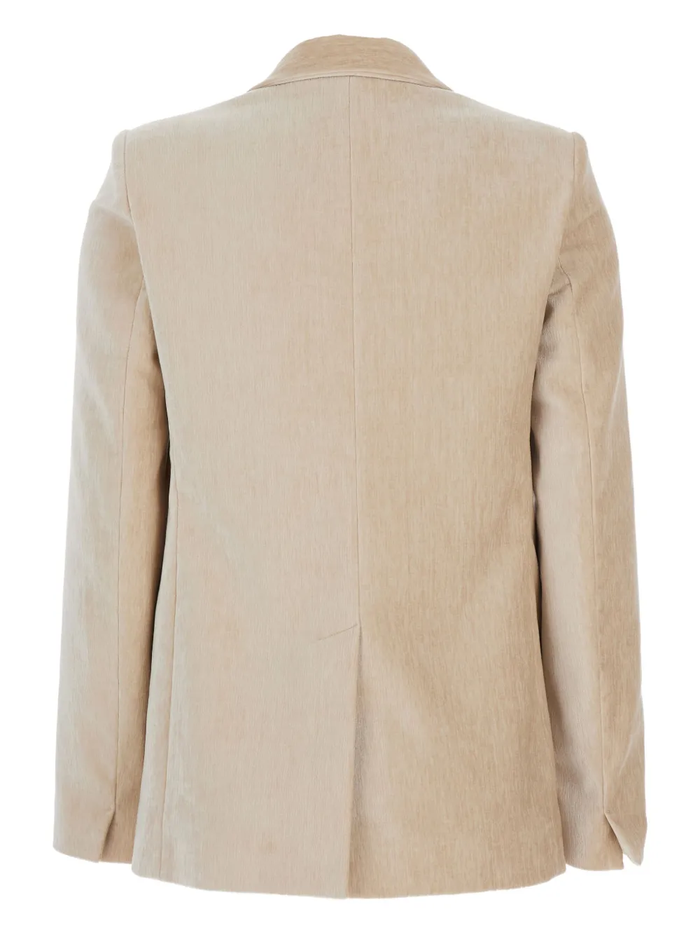 Двубортный пиджак с текстурой бежевого бархата, застежка на лацкан, длинные рукава, застежка на пуговицы.