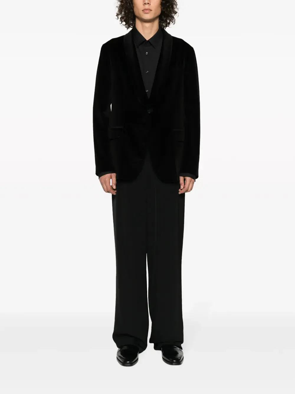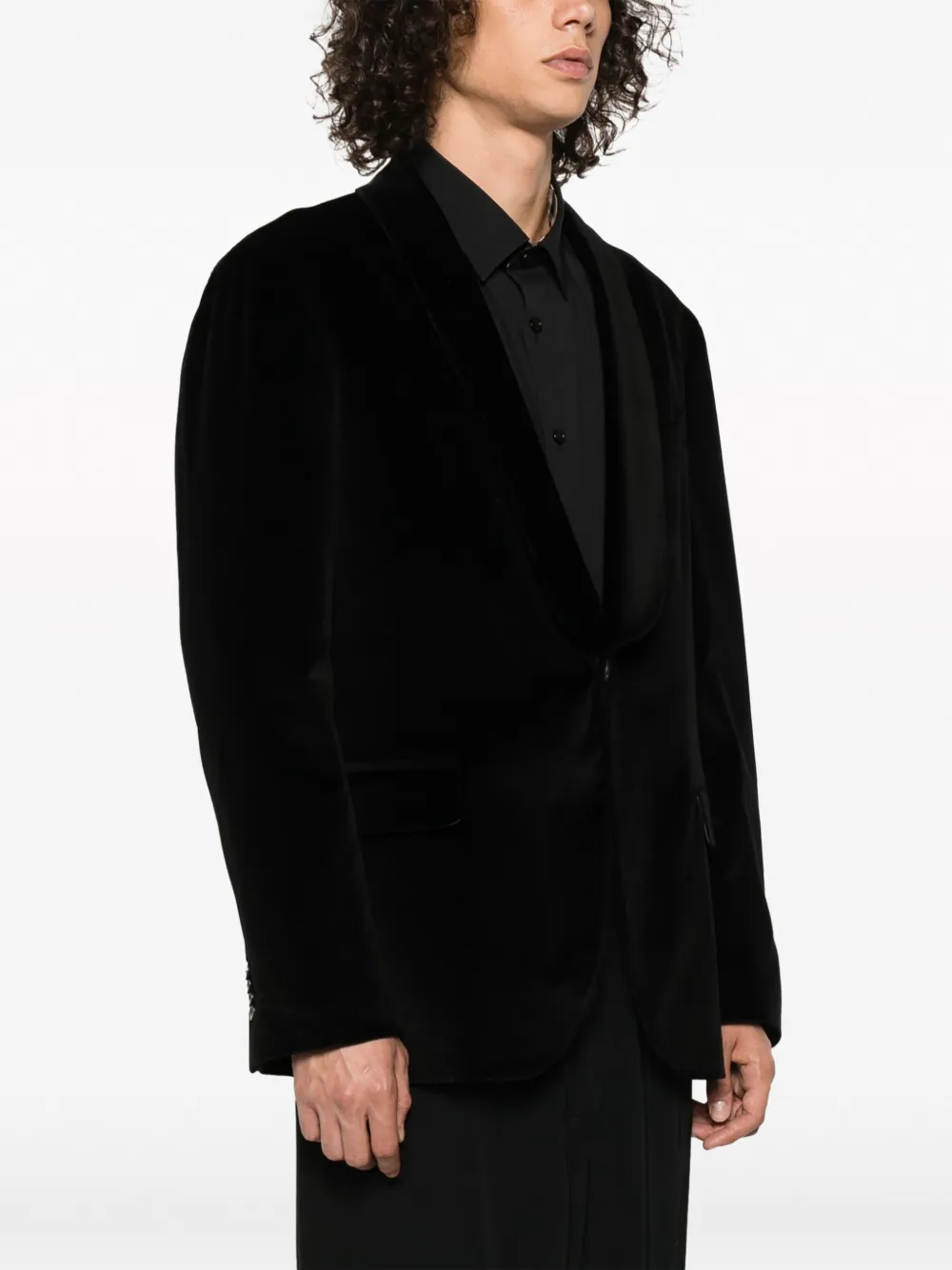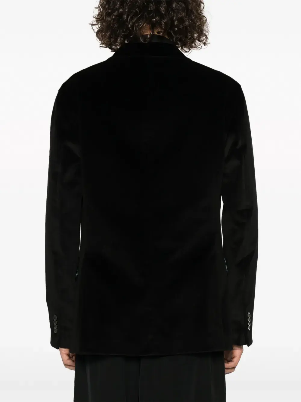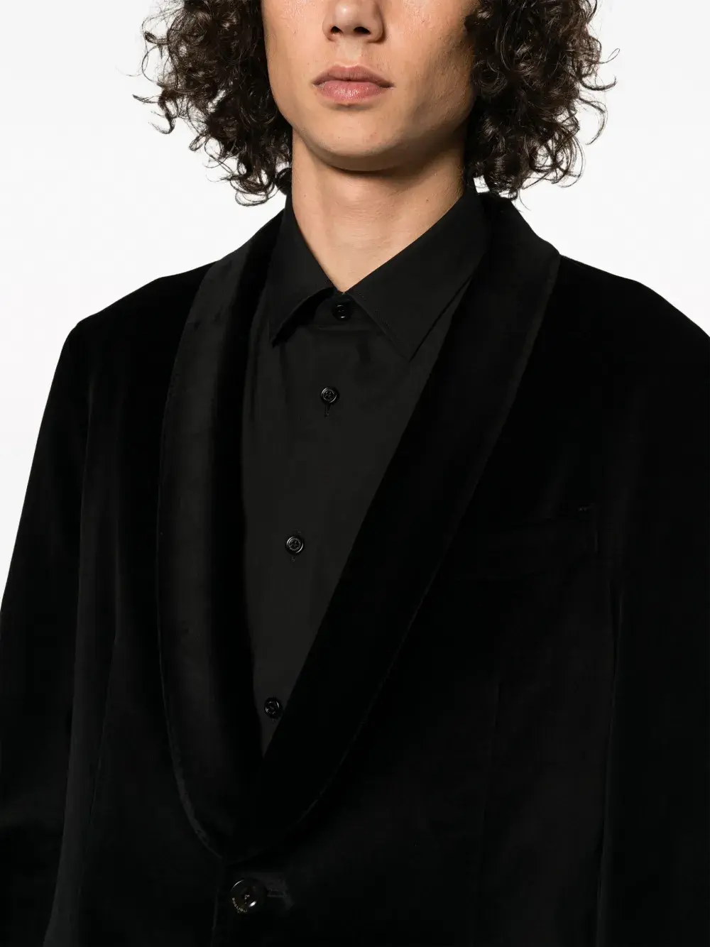 Черный, эластичный хлопок, бархатистое покрытие, лацканы-шалька, застежка на пуговицах спереди, длинные рукава, манжеты на пуговицах, прорезной карман на груди и два передних кармана с клапанами.