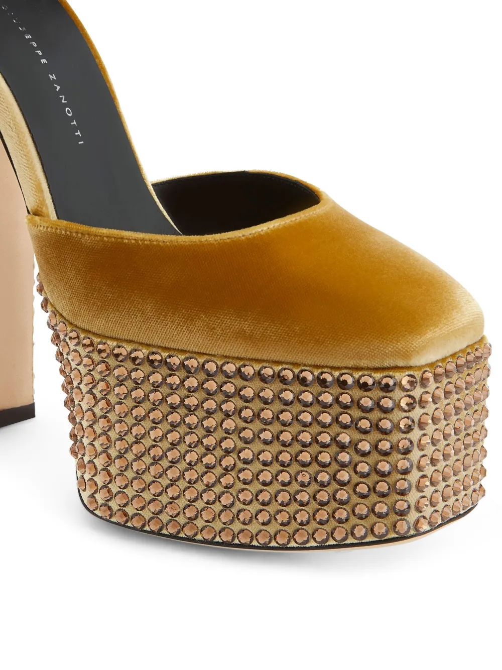 Золотистый, телячья кожа, бархатистое покрытие, украшения из горного хрусталя, квадратный носок, ремешок на щиколотке с пряжкой, подошва на платформе, высокий блочный каблук и стелька с логотипом.