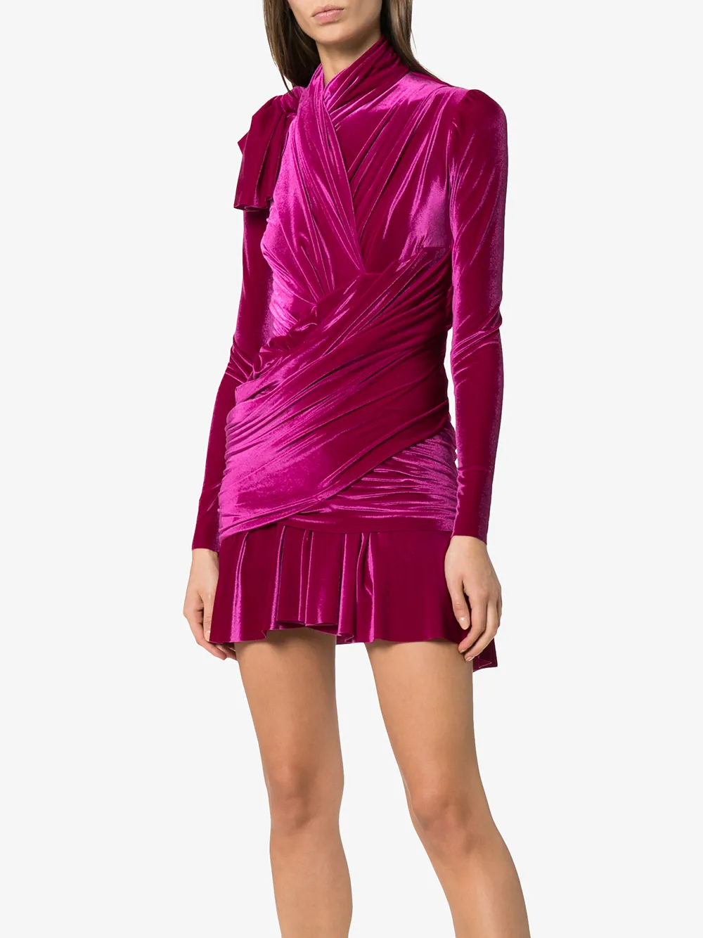 Фиолетовое бархатное платье с запахом от Balenciaga. Высокий ворот, длинные рукава, декоративная завязка на плече, оборки снизу, короткая длина.