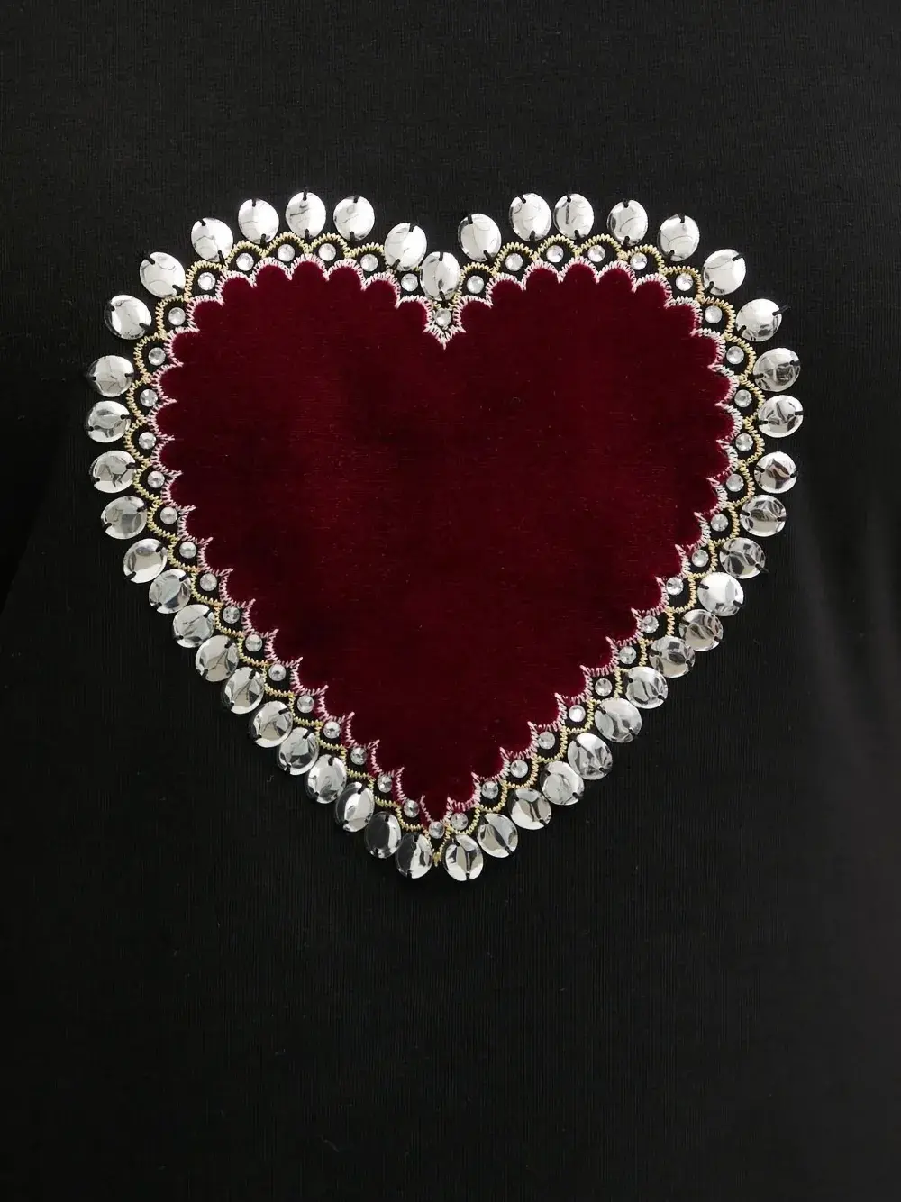 Черный бархат, украшение в виде сердца из кристаллов, короткие рукава, круглый вырез.