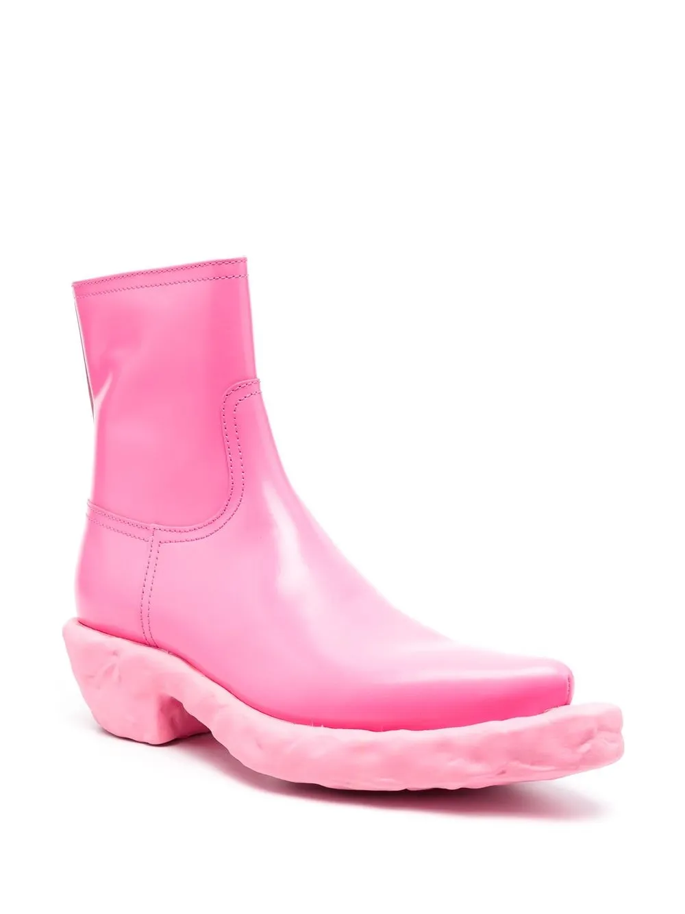 Розовый, кожа, заостренный носок, модель в стиле вестерн, массивная резиновая подошва, низкий блочный каблук и молнии на манжетах.
