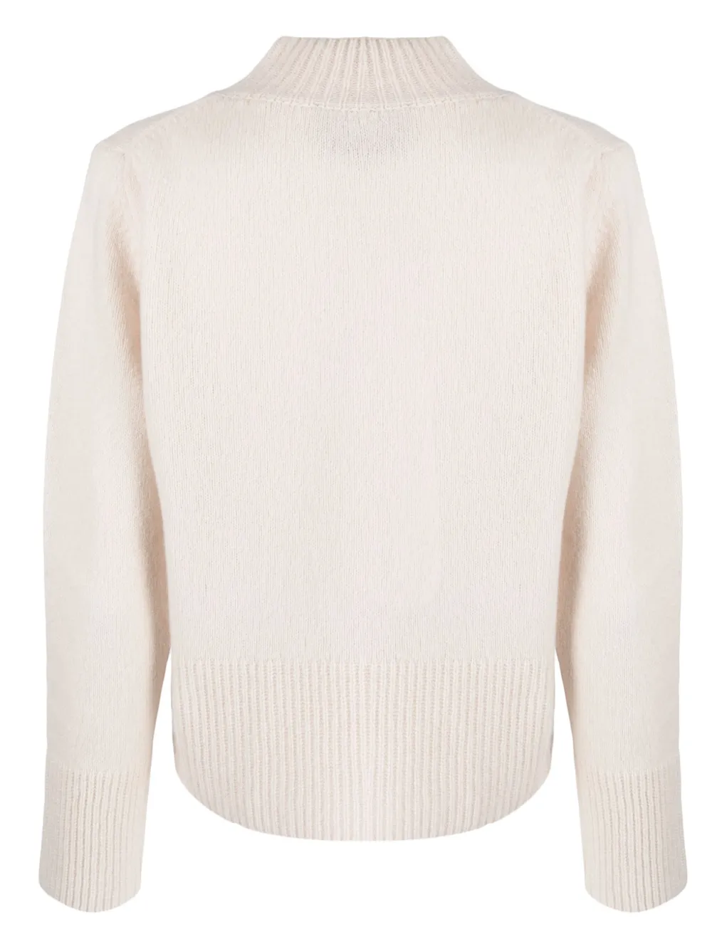 Цвет слоновой кости, необработанная шерсть, трикотажный материал, высокий воротник и длинные рукава.
