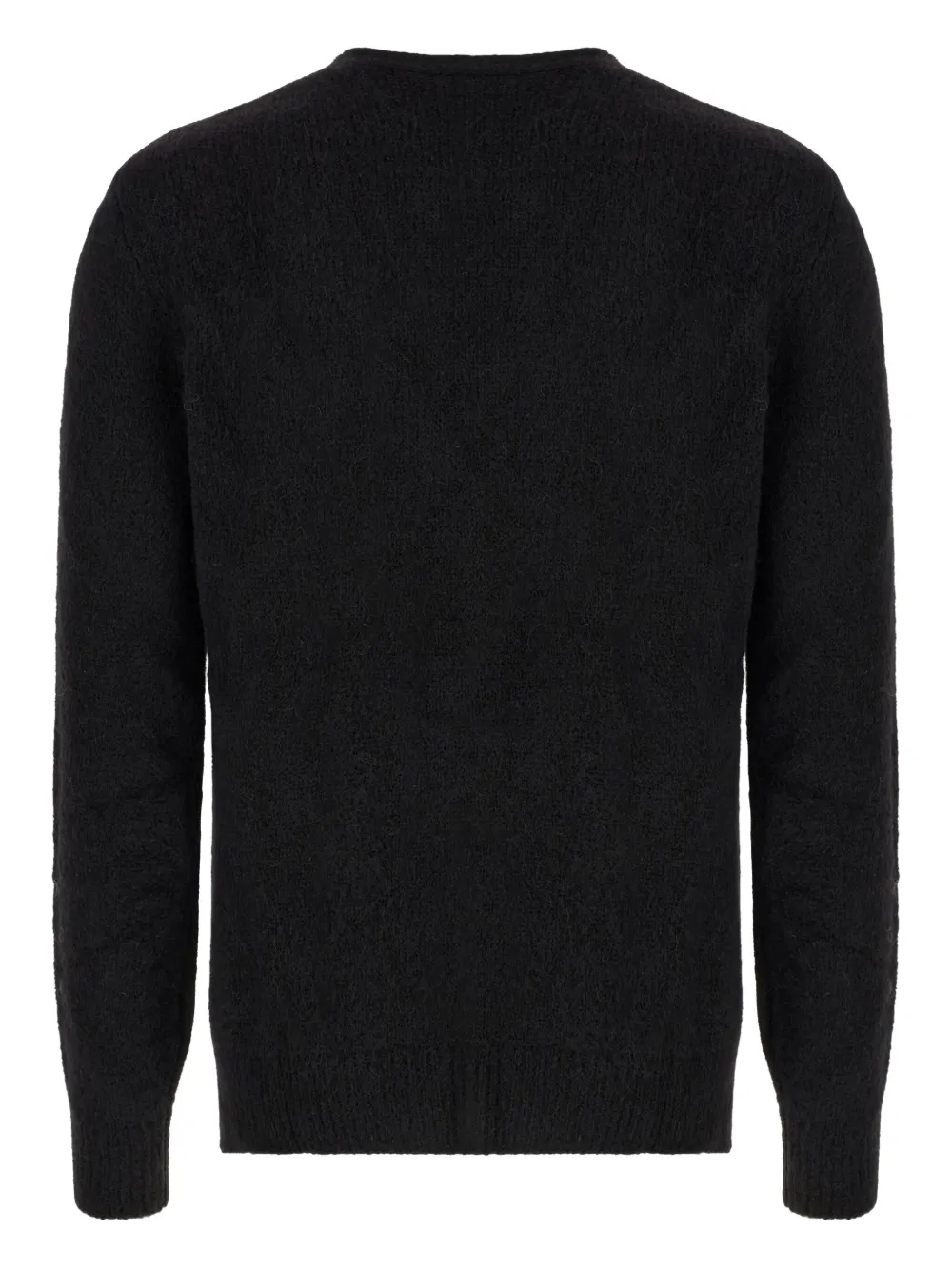 Черный V-образный вырез, застежка на пуговицы, ребристый подол, ребристые манжеты.