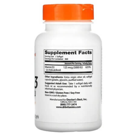 Витамин D3 от Doctor's Best содержит D3 (в виде холекальциферола), необходимый организму для регулирования уровня фосфора и кальция, способствующих здоровью костей, зубов и сердца. Витамин D3 вырабатывается в коже за счет поглощения солнечных УФ-лучей и в ограниченных количествах поступает с пищей. Защита от солнца и климатические факторы могут влиять на низкий уровень витамина D3. Витамин D3 полезен для иммунной и сердечно-сосудистой систем, плотности и структуры костей, а также функционирования клеток. Он играет важную роль в работе большинства органов и систем организма и влияет на химические посредники иммунной системы.