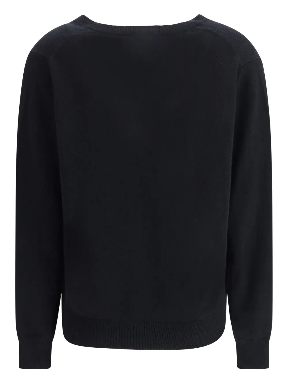 Черный кашемир с V-образным вырезом, длинными рукавами и ребристым подолом.
