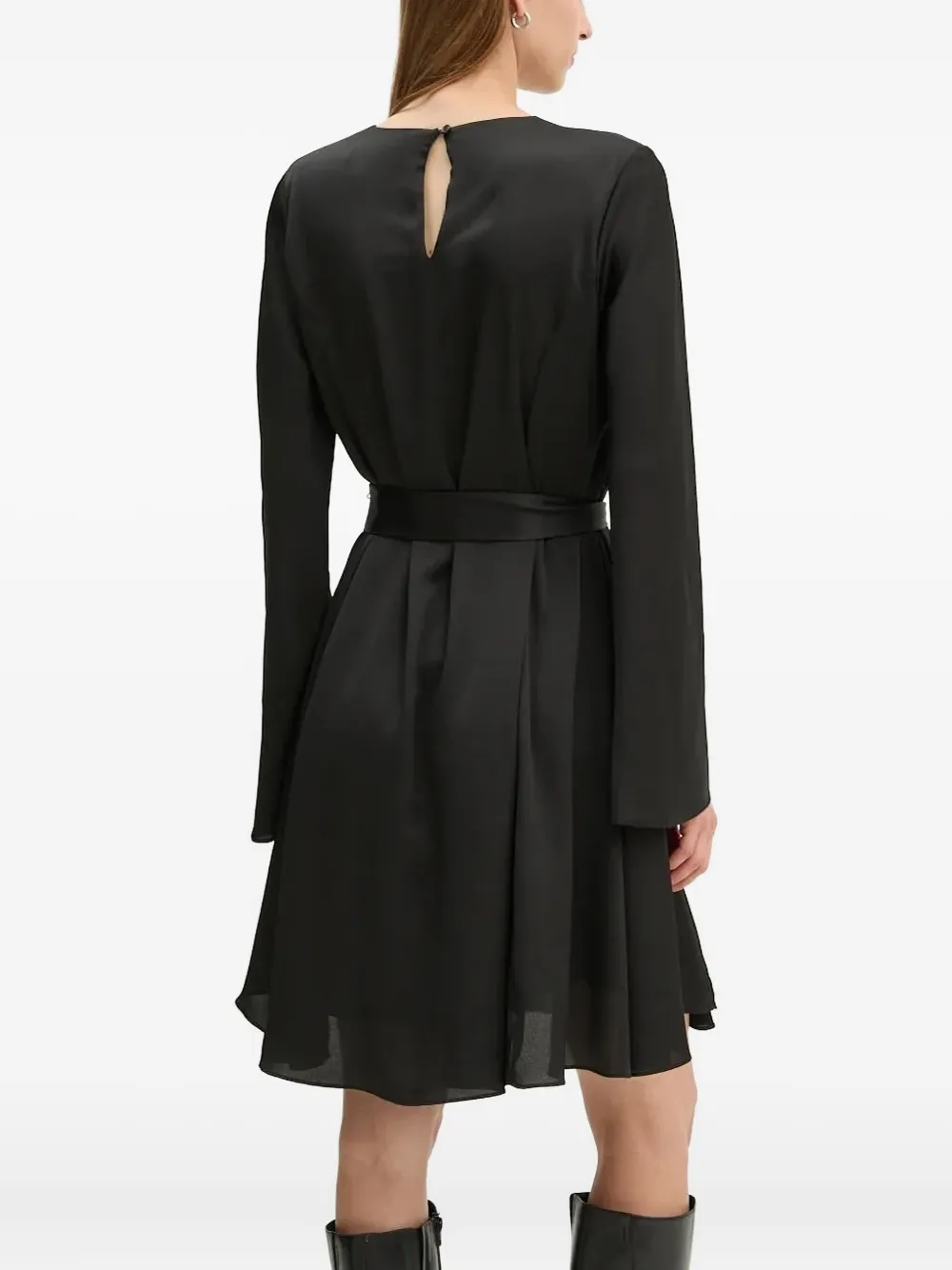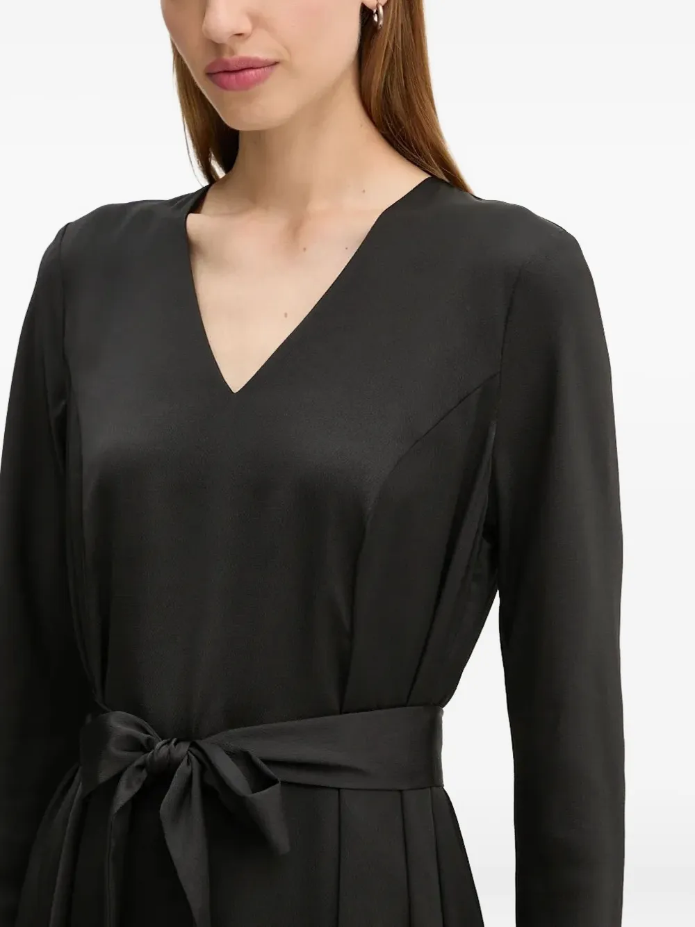 Черный топ с V-образным вырезом, длинными рукавами, расклешенным подолом и завязывающимся поясом.