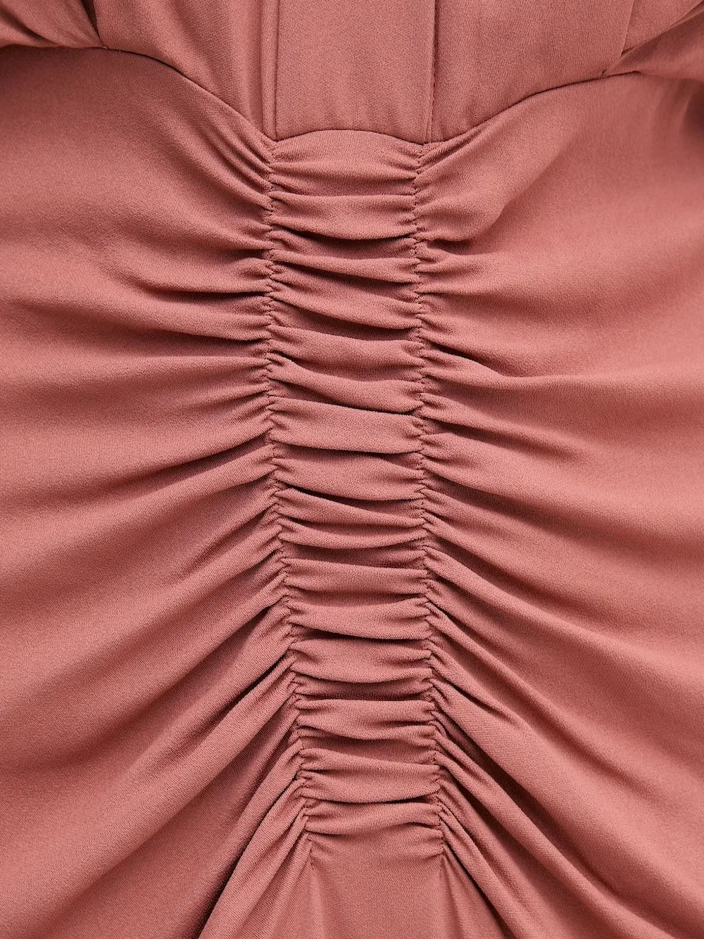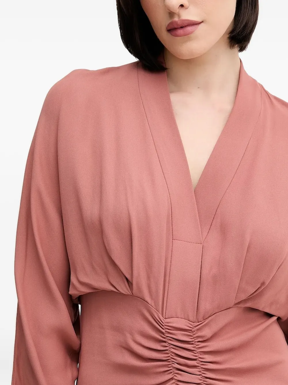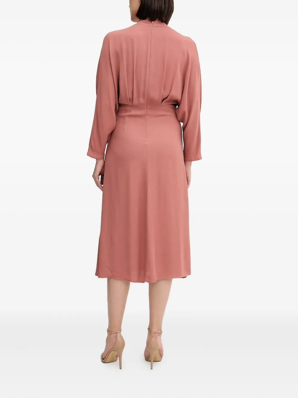 Юбка А-силуэта цвета пыльной розы с V-образным вырезом и присборенными рукавами три четверти.