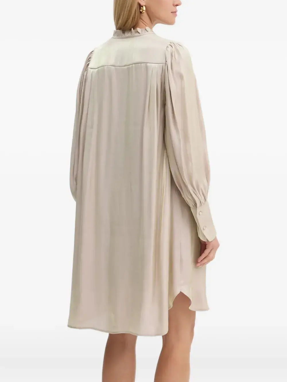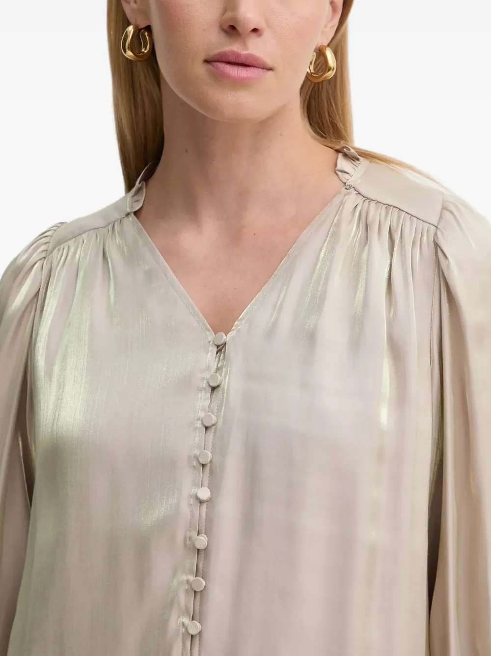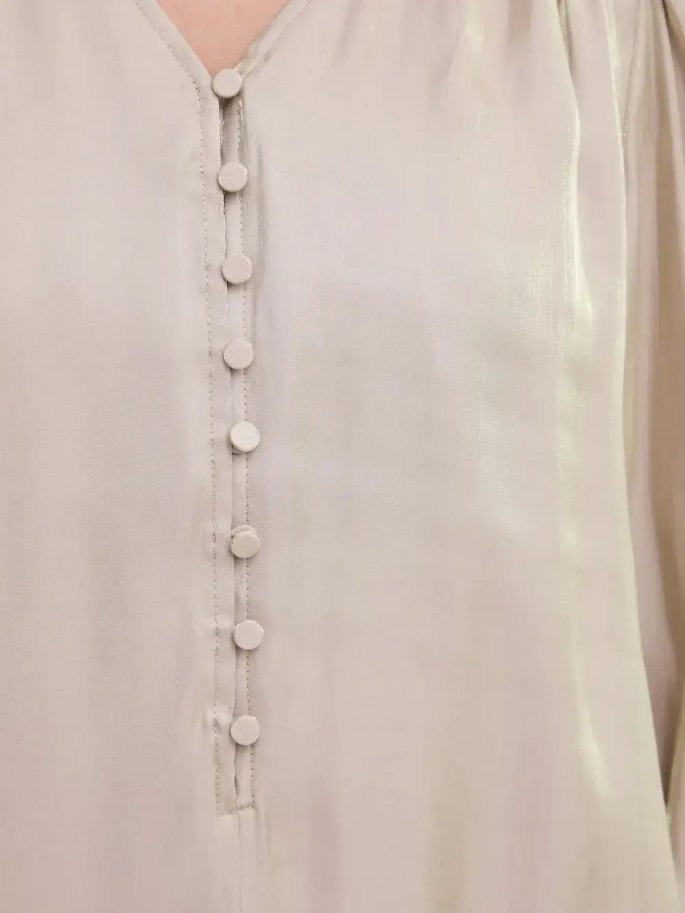 Бежевый, с застежкой на пуговицы спереди, V-образным вырезом, длинными рукавами.