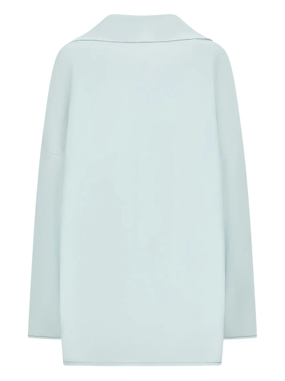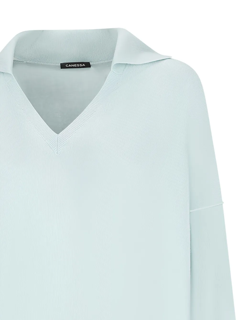 Светло-голубая водолазка с V-образным вырезом, длинными рукавами и прямым подолом.