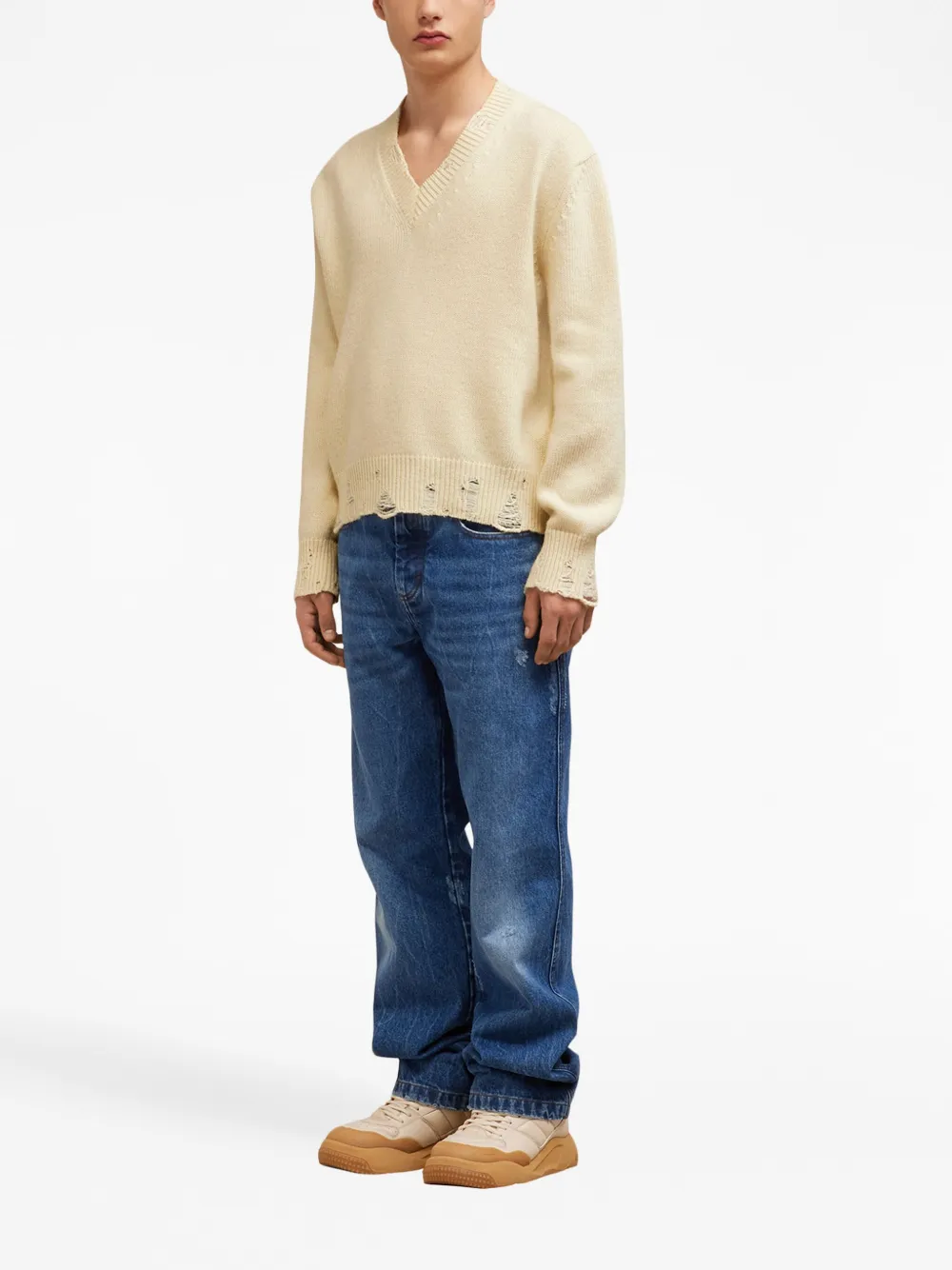 Светло-бежевый, шерсть, трикотажный материал, V-образный вырез, приспущенные плечи и модель с прорезями. Это унисекс-модель. Обратите внимание, что для нее используется мужская размерная сетка.