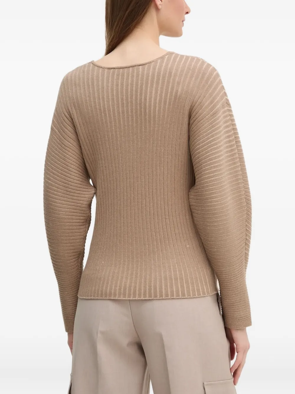 Бежевый ребристая вязка, V-образный вырез, длинные рукава, прямой подол