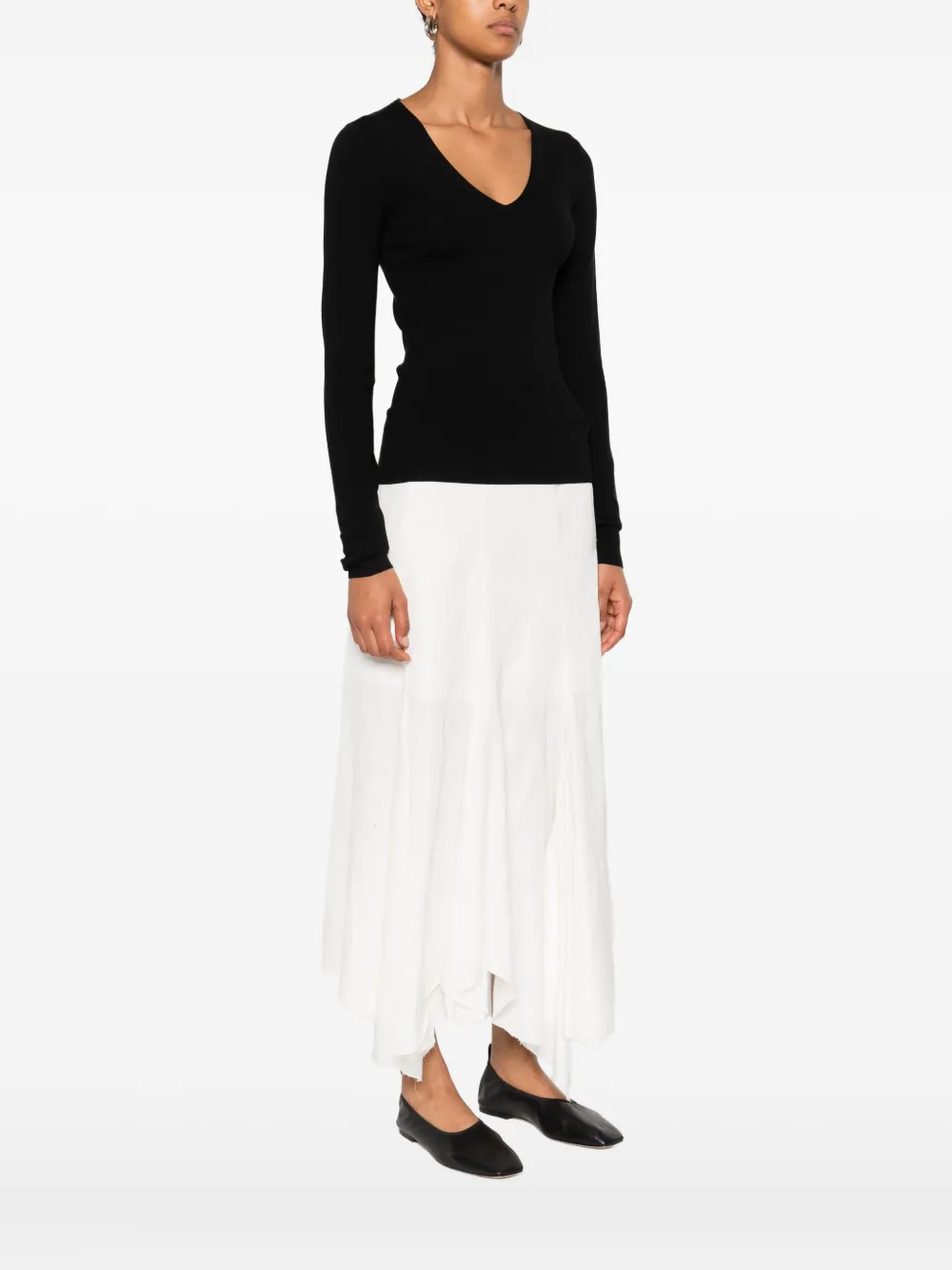 Черный V-образный вырез, длинные рукава, прямой подол, ребристый подол.