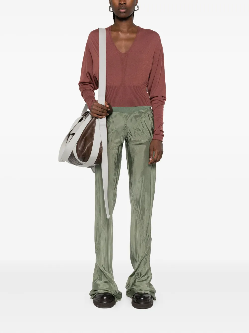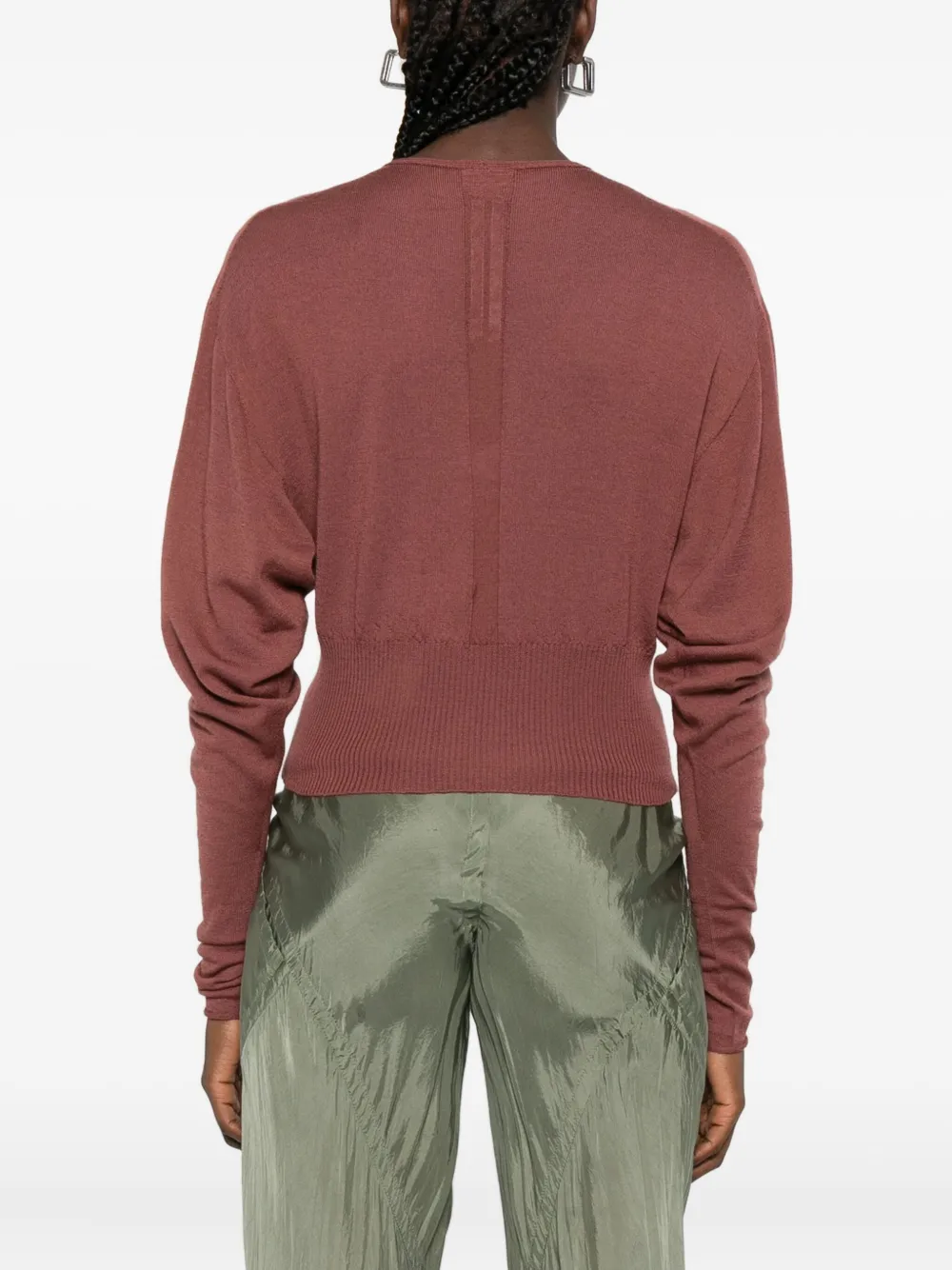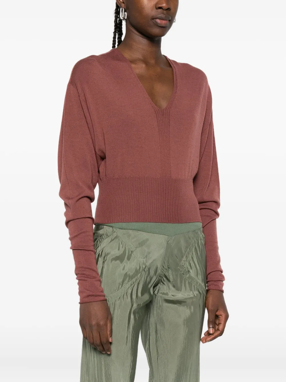 V-образный вырез из розового дерева, длинные рукава, ребристый подол, укороченная длина