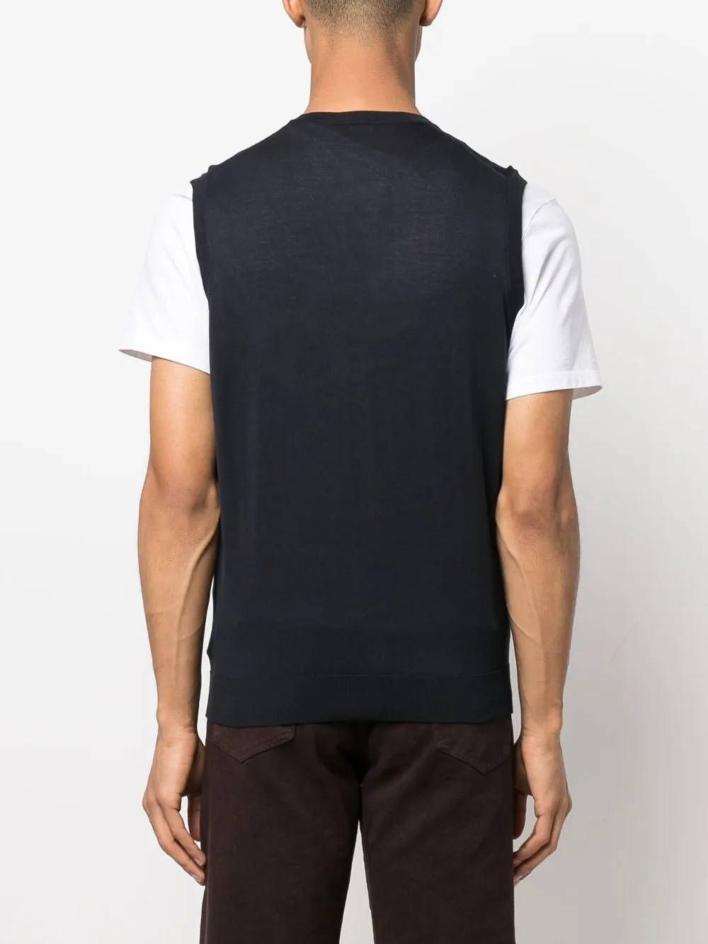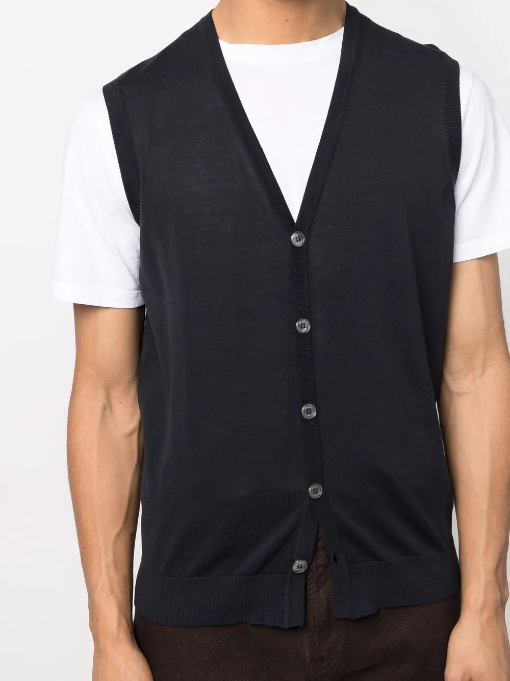 Детали в рубчик, V-образный вырез, застежка на пуговицах спереди и без рукавов.