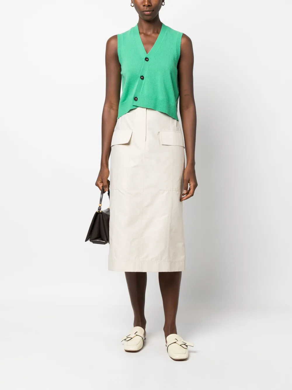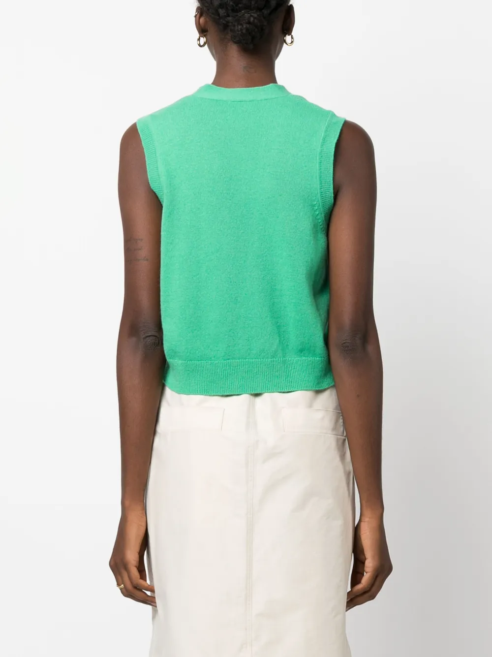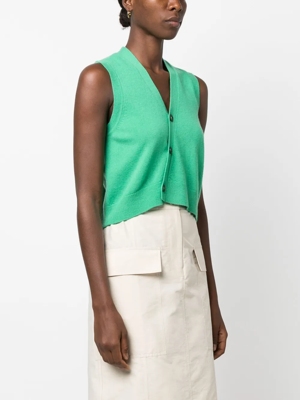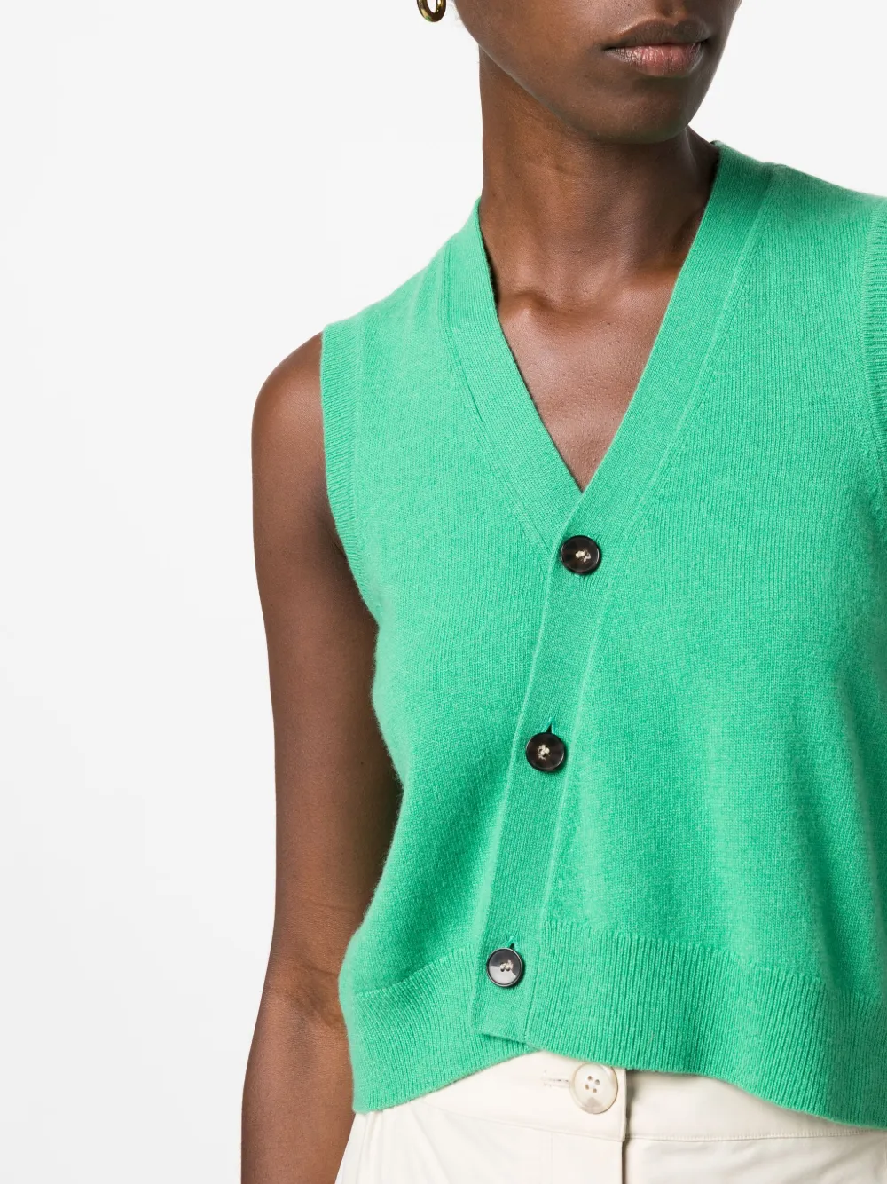 Ярко-зеленый, овечья шерсть, трикотажный материал, V-образный вырез, смещенная застежка на пуговицах спереди, без рукавов и асимметричный подол. Узнать больше о том, какие товары получают отметку «Ответственный выбор», можно из материала «Как мы оцениваем экологичность и этичность».