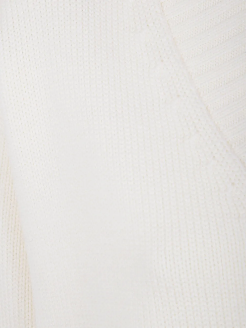 Белый шерстяной трикотаж с V-образным вырезом, ребристым подолом и длинными рукавами.