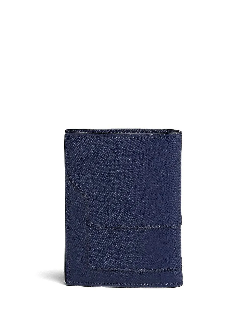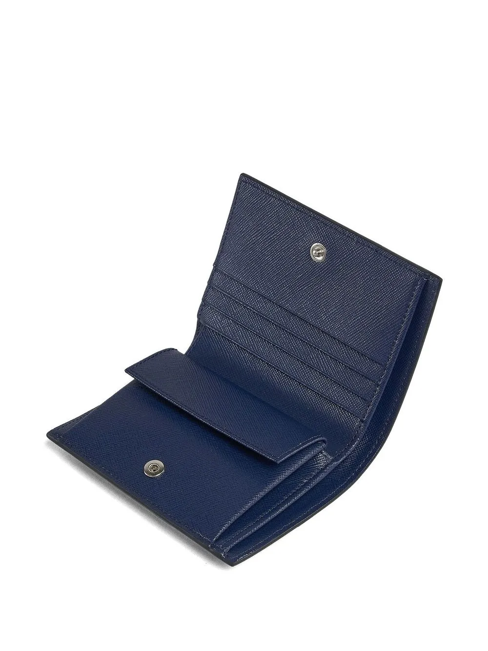 Синий, телячья кожа, фактурная отделка, два сложения, вышитый логотип спереди, застежка на пуговицы, внутренний карман с клапаном, отделение для купюр и внутренние отделения для карт.