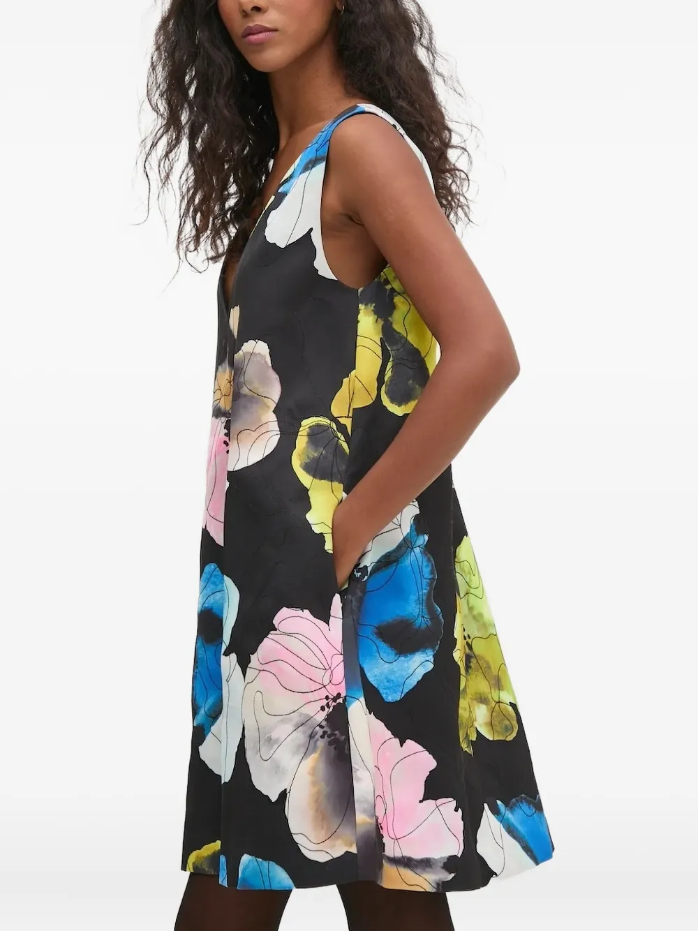Черное платье без рукавов с цветочным принтом, V-образным вырезом, стеганой текстурой, А-силуэта