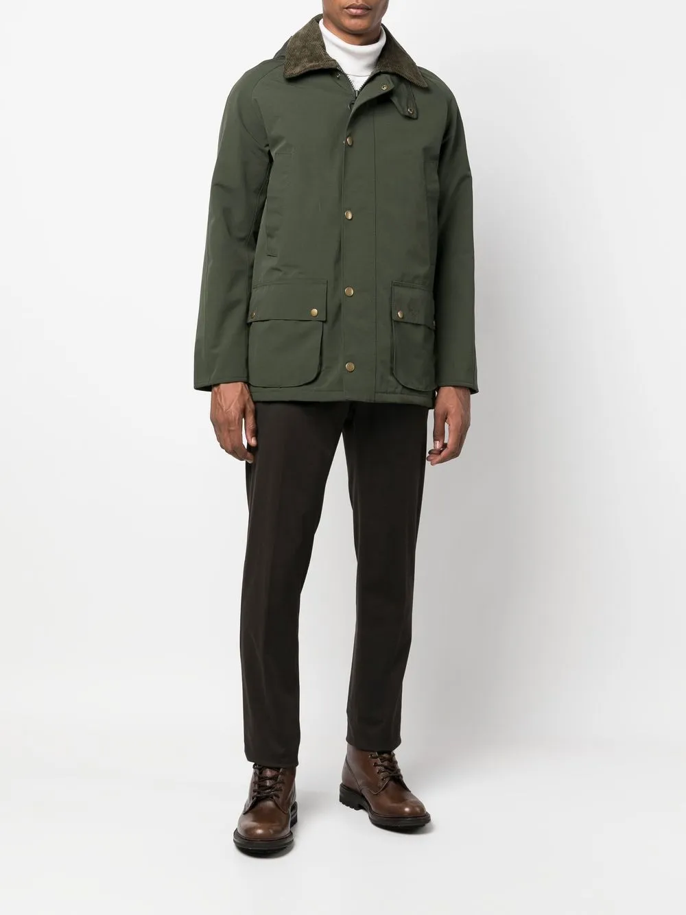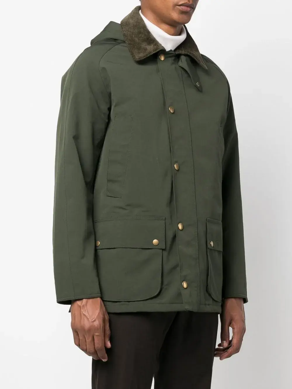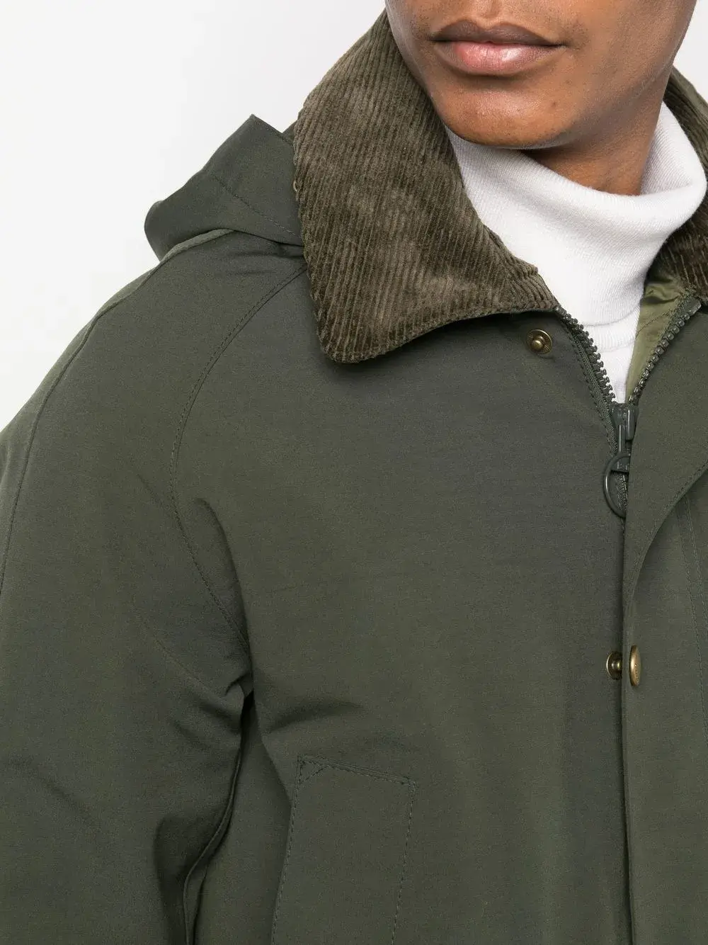 Оливково-зеленый, смесовый хлопок, вощеный материал, вельветовый воротник, застежка на кнопках спереди, длинные рукава и два кармана с клапанами по бокам.