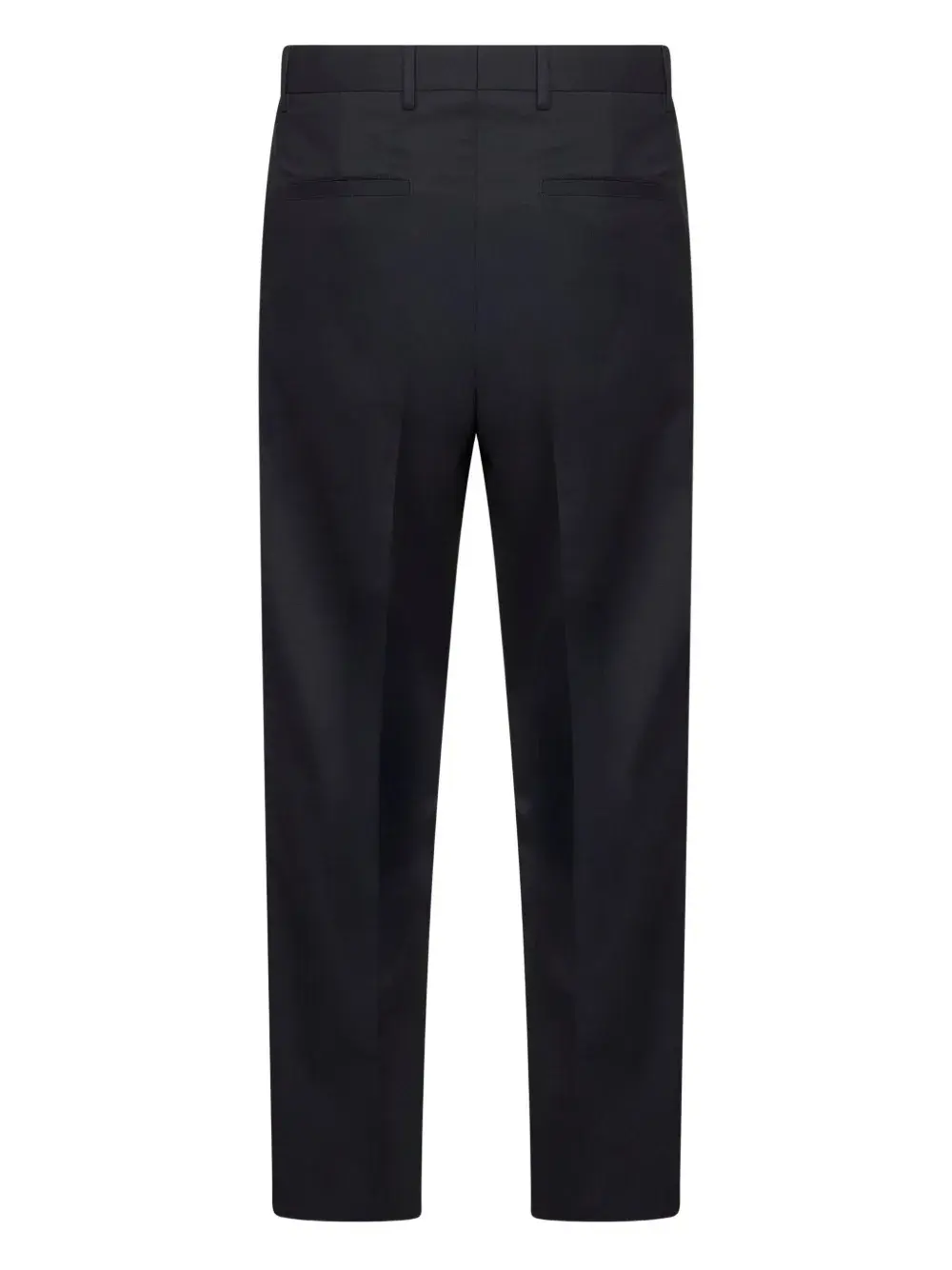 Синие шлевки для ремня, задние прорезные карманы, заглаженные складки.