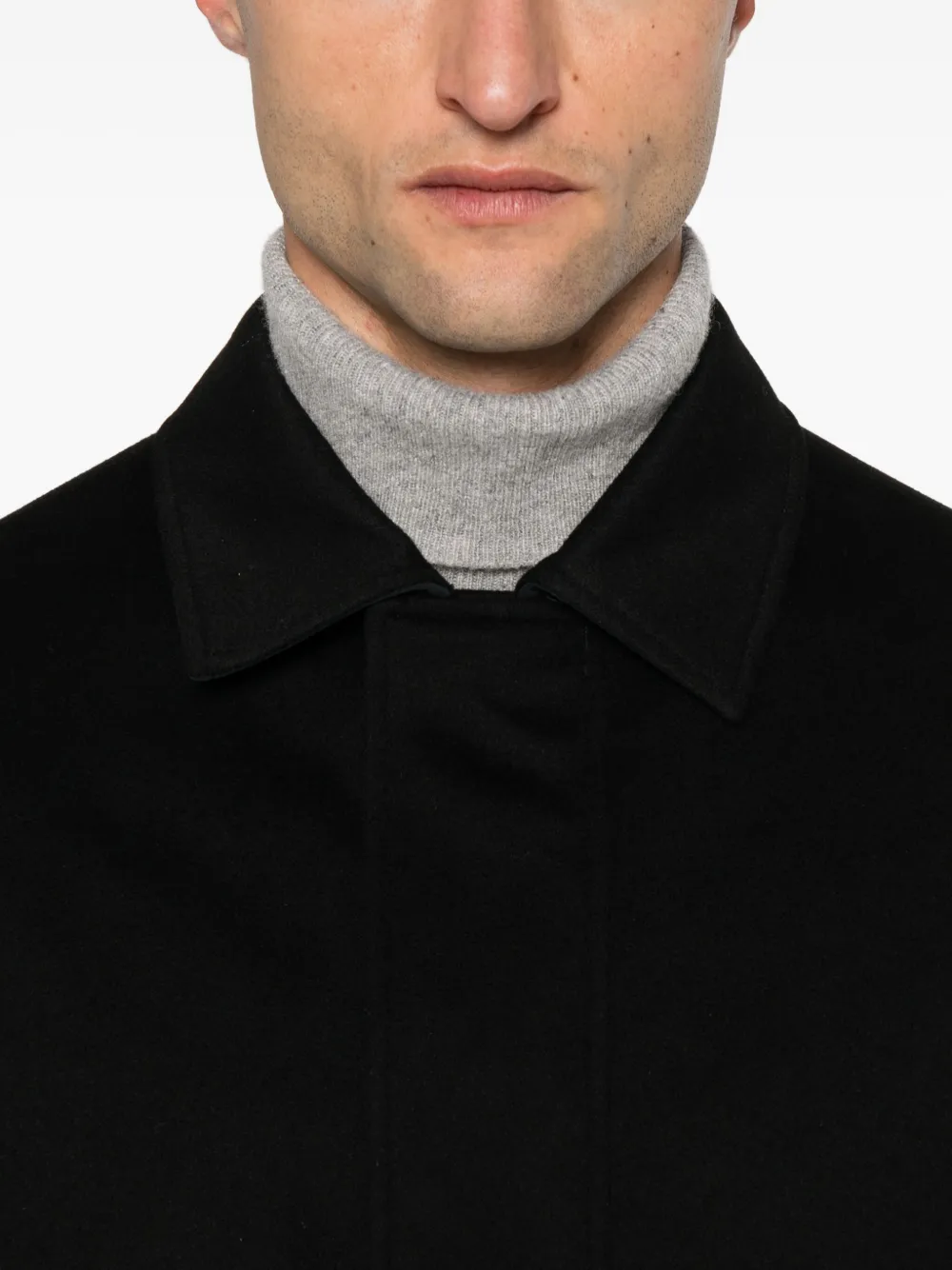 Черный воротник, длинные рукава, прорезные карманы, прямой подол, застежка на пуговицы.