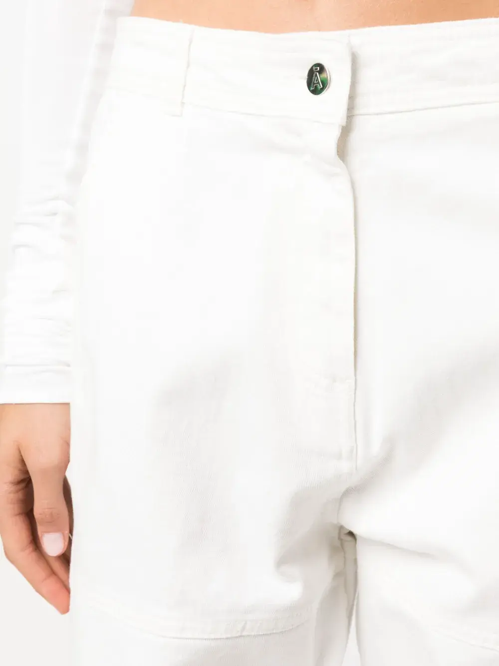 Цвет слоновой кости, эластичный хлопок, завышенная талия, петли для ремня, застежка на молнии и пуговице спереди, два прорезных кармана по бокам, два накладных кармана сзади, накладные карманы и широкий крой.