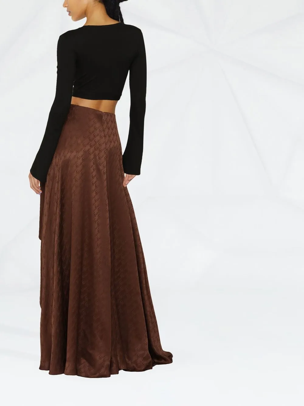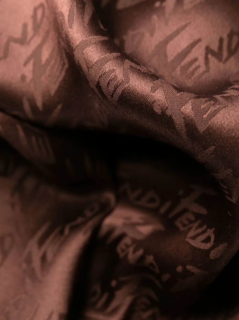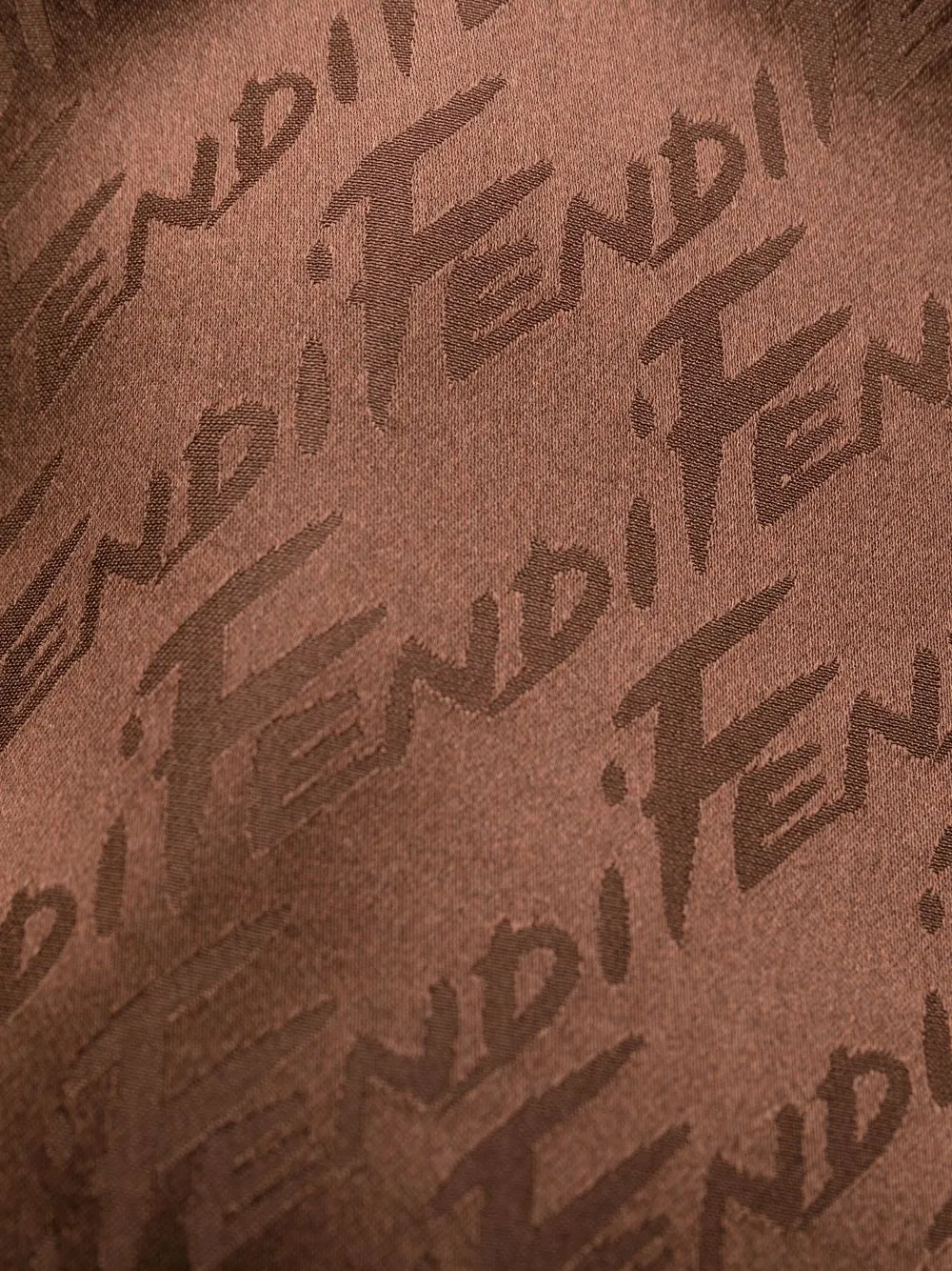 Темно-коричневый, свободный крой, многослойная деталь, сплошной принт с логотипом и потайная застежка на молнии сзади.