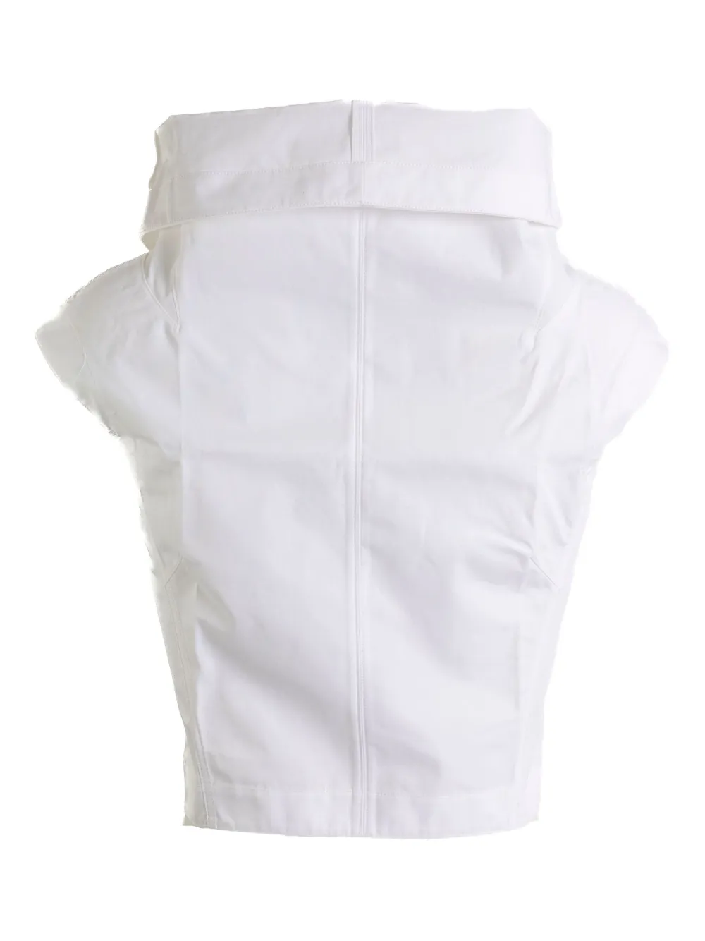Белый хлопковый жакет без рукавов с широким воротником и укороченным подолом.