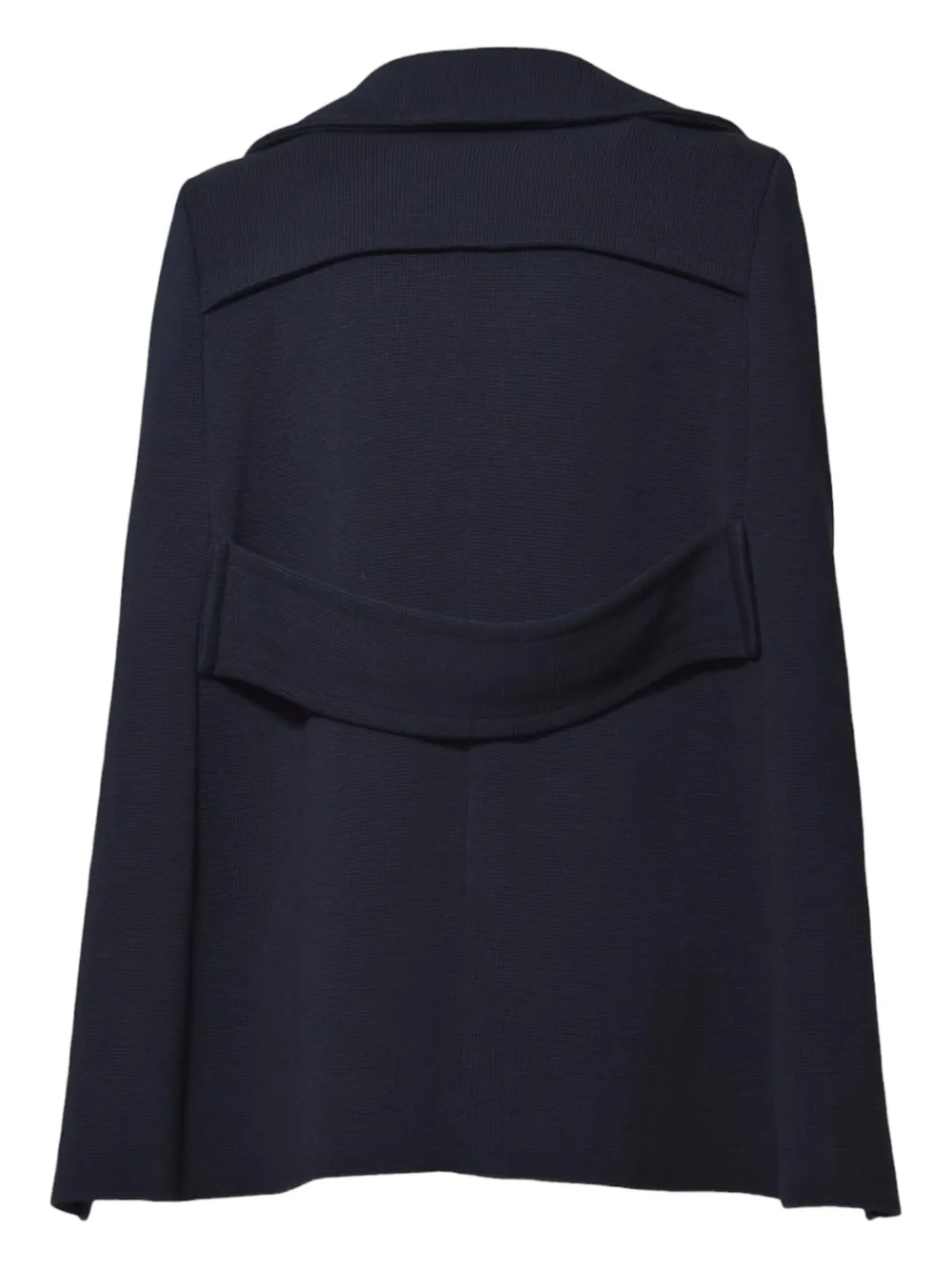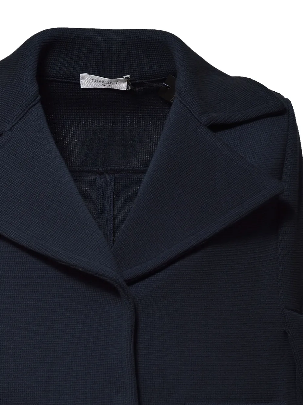 Темно-синяя потайная застежка спереди, накладные карманы спереди, широкие отвороты с заостренным краем, застежка-мартингейл сзади