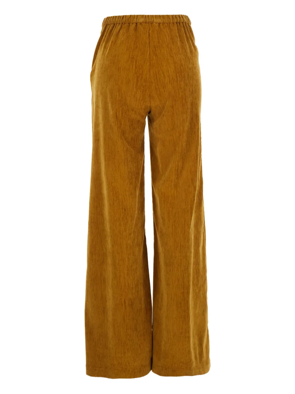 Текстура вельвета горчично-желтого цвета, широкие штанины, потайная застежка-молния сбоку, два диагональных кармана по бокам, эластичный пояс сзади.