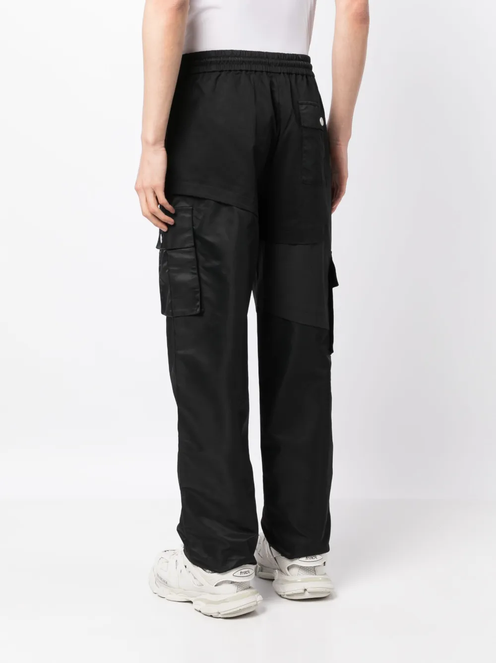 Черный, эластичный хлопок, вставки, швы, кулиска на талии, широкий крой, два прорезных кармана по бокам, два накладных кармана по бокам, карман с клапаном сзади и прямой подол.