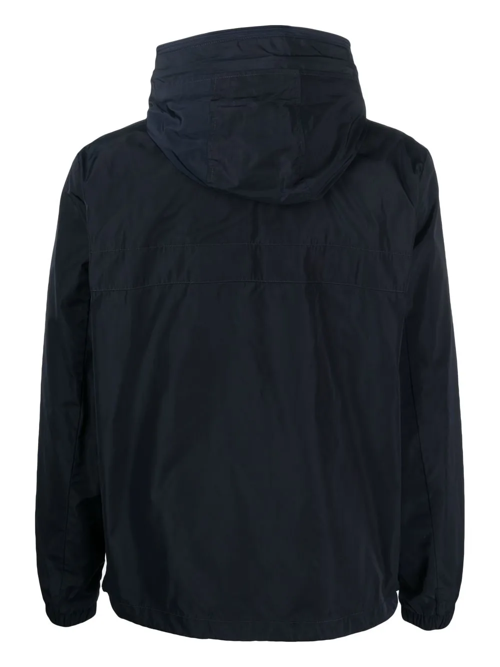 Темно-синий, нашивка с логотипом на рукаве, классический капюшон, застежка на молнии спереди, длинные рукава, два кармана на молнии по бокам и прямой подол.