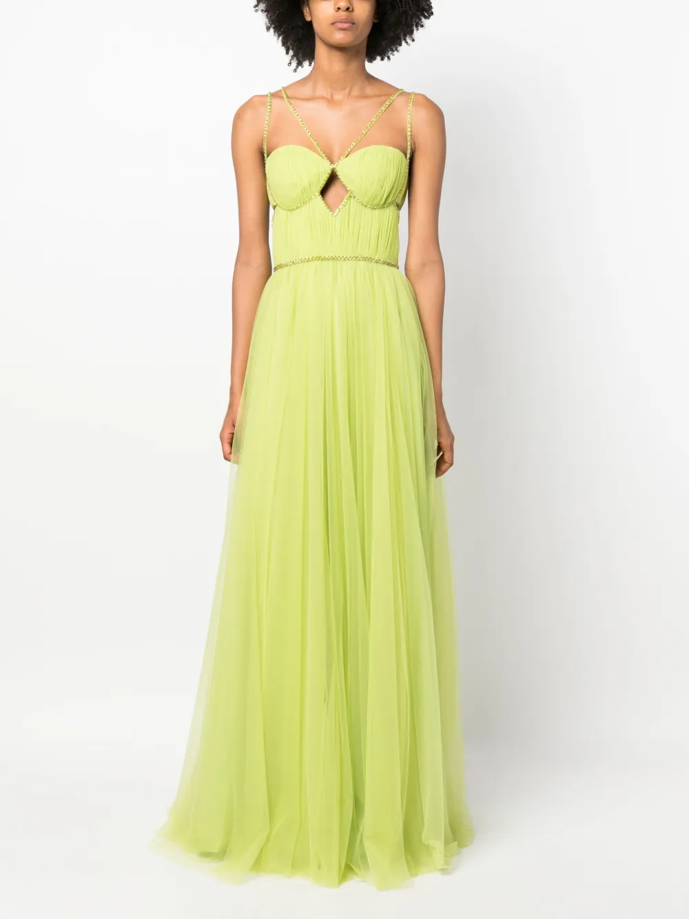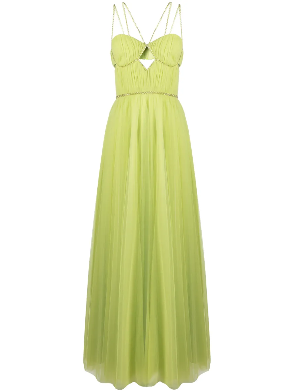Салатовый, отделка бисером, вырезные детали, вытачки, плиссированная модель, вырез в форме сердца, тонкие бретели, потайная застежка на крючках и молнии сзади, открытая спина, расклешенный подол и длина макси.
