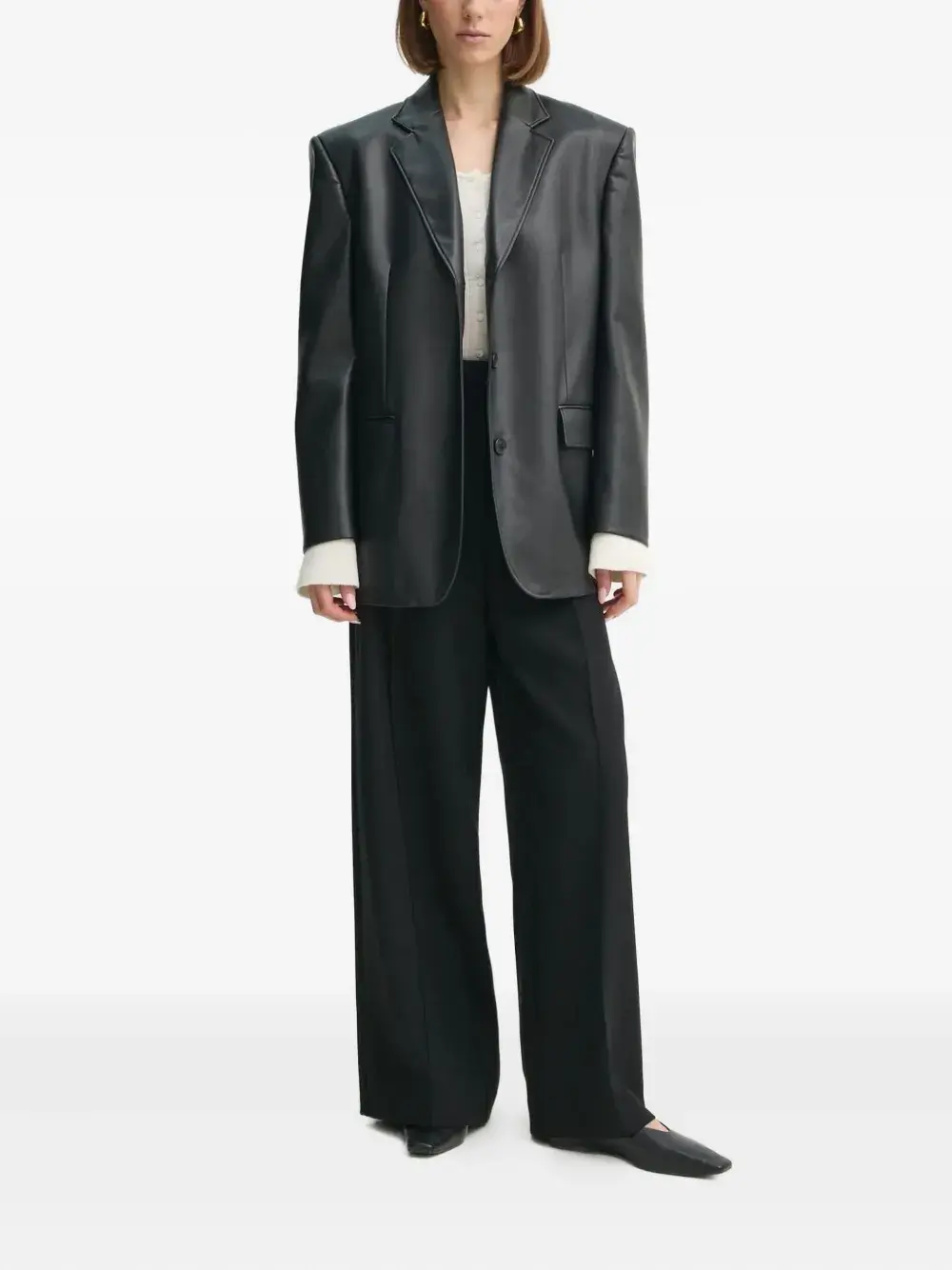 Белая шерсть, застежка на пуговицы спереди, круглый вырез, длинные рукава.