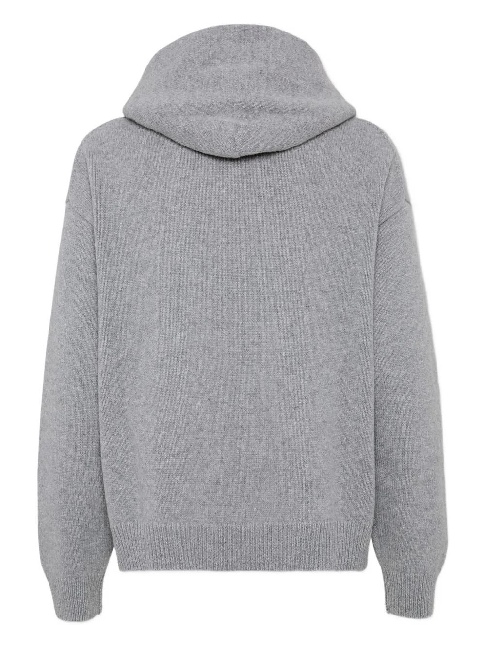 Серый капюшон, карман-кенгуру, ребристый подол, ребристые манжеты, длинные рукава.