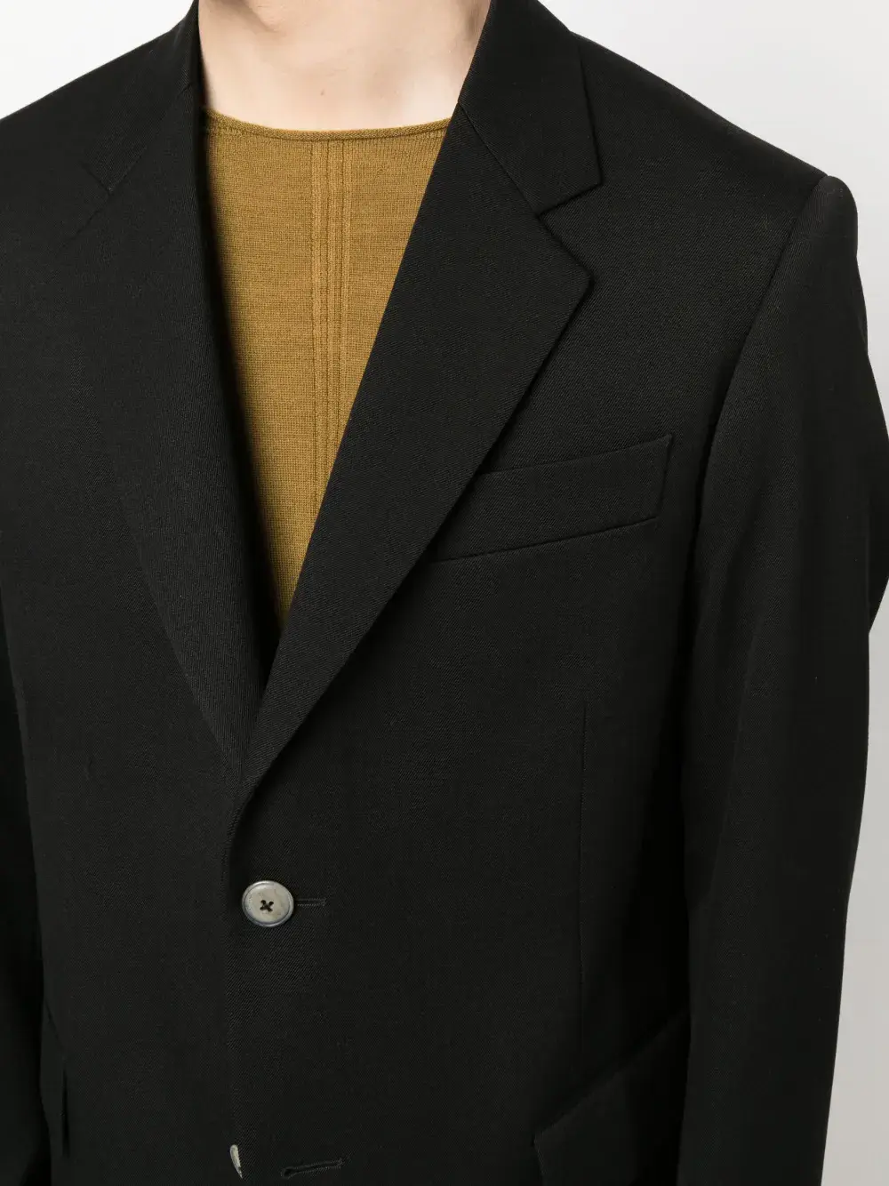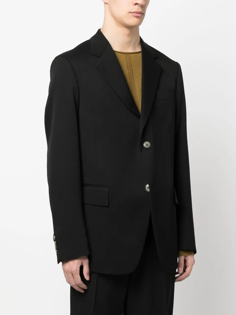 Черный, шерсть, зазубренные лацканы, два передних кармана с клапанами, застежка на пуговицах спереди и длинные рукава.