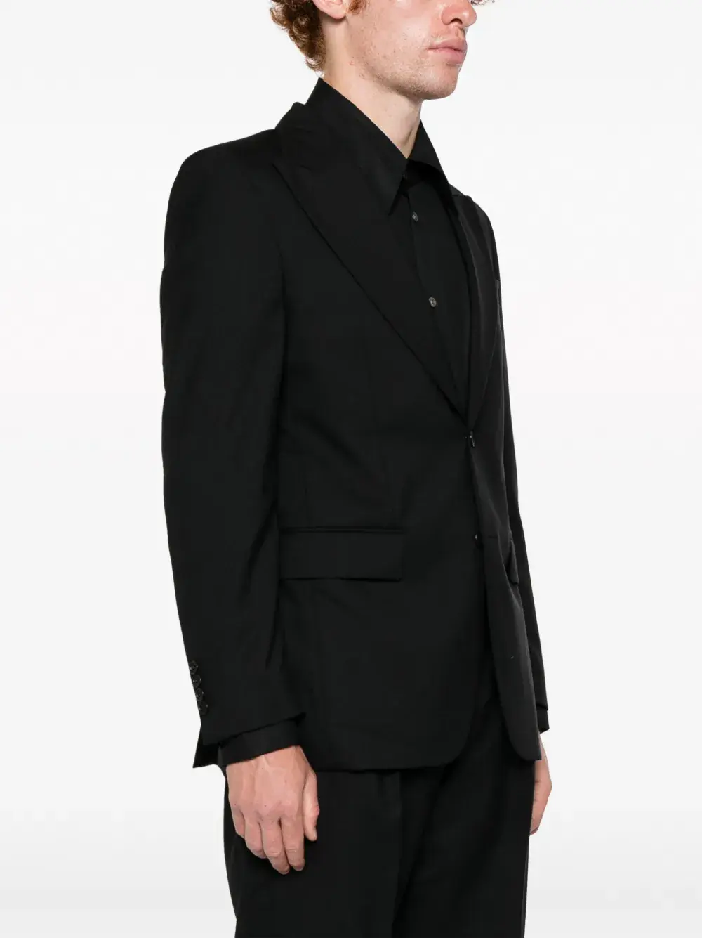 Черный, шерсть, защипы, заостренные лацканы, застежка на пуговицах спереди, длинные рукава, манжеты на пуговицах, два передних кармана с клапанами и две боковые шлицы сзади.