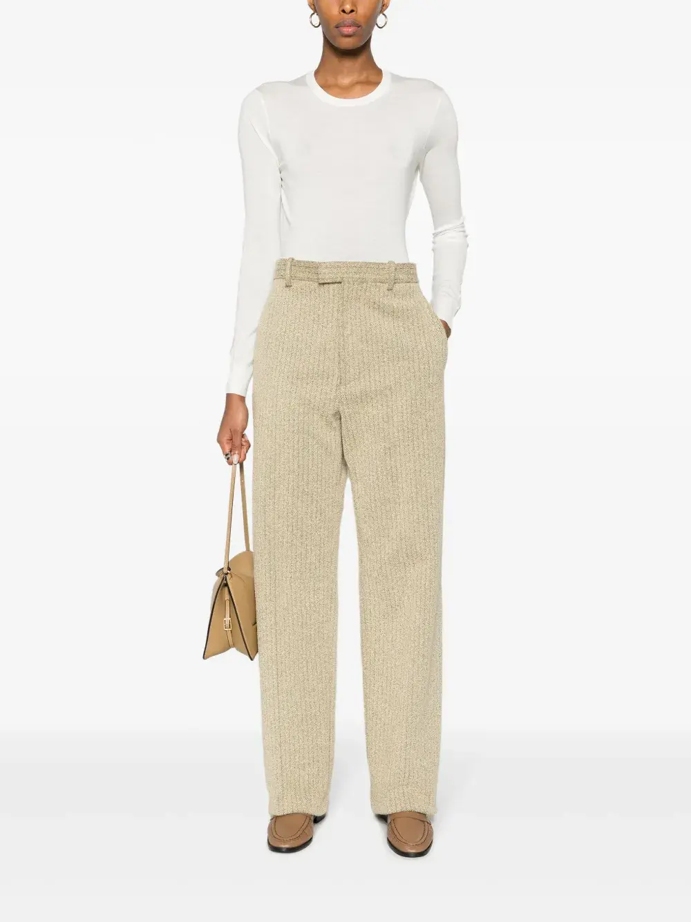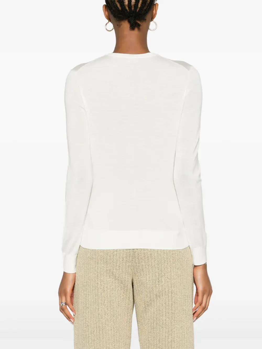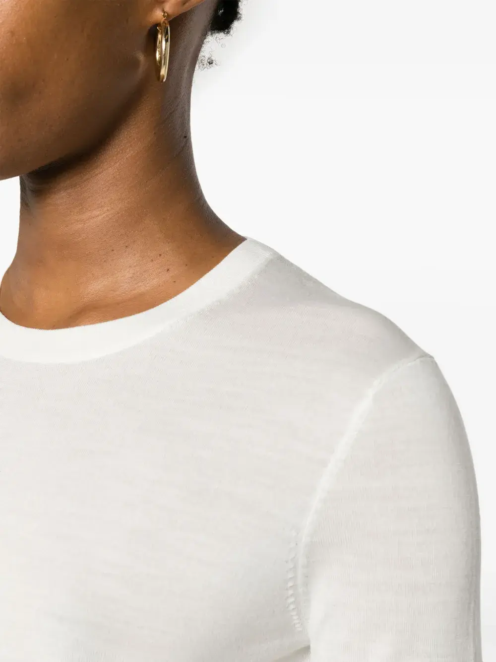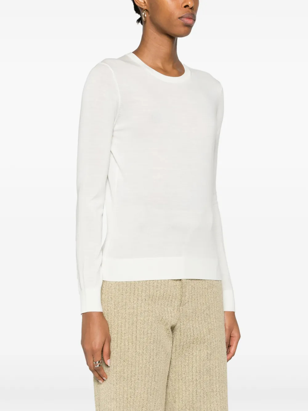 Цвет слоновой кости, смесовая шерсть, тонкая вязка, круглый вырез, длинные рукава, прямой подол и отделка в рубчик.