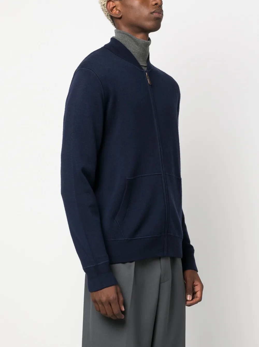 Темно-синий, шерсть, эффект войлока, бейсбольный воротник, карман-муфта, застежка на молнии спереди, длинные рукава и прямой подол.