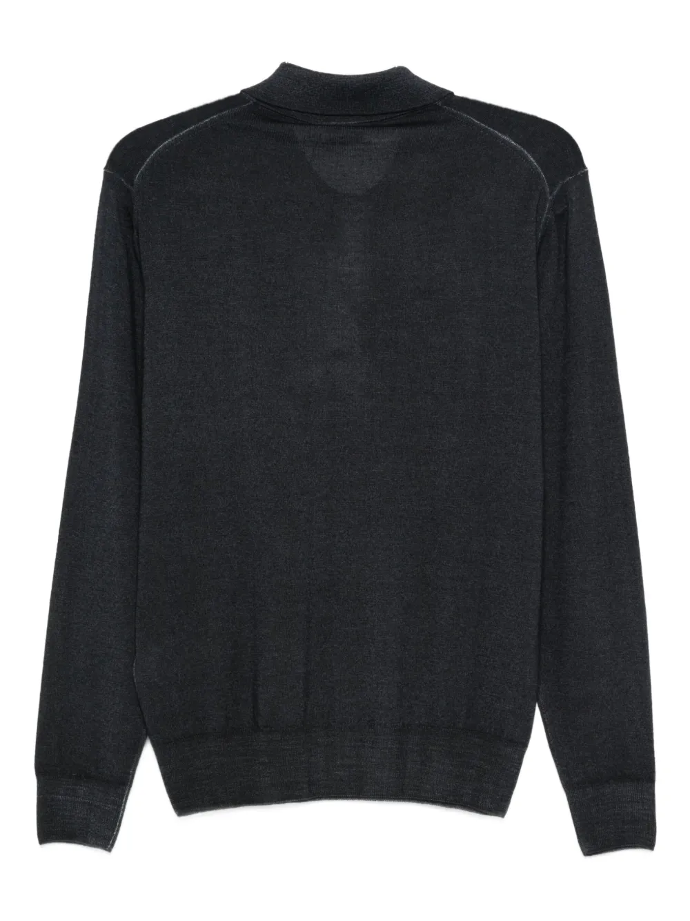 Серая шерстяная рубашка с длинными рукавами, воротником-поло, застежкой на пуговицы, ребристыми манжетами.