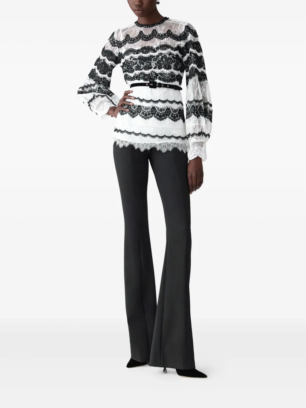 Черная шерстяная модель с высокой талией, центральным швом спереди и застежкой-молнией.