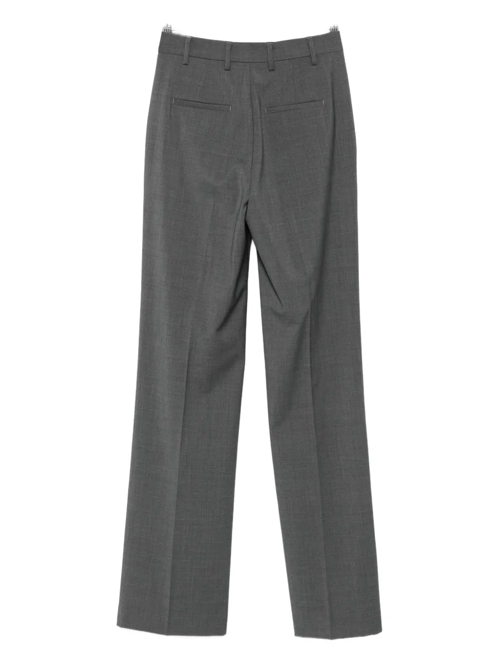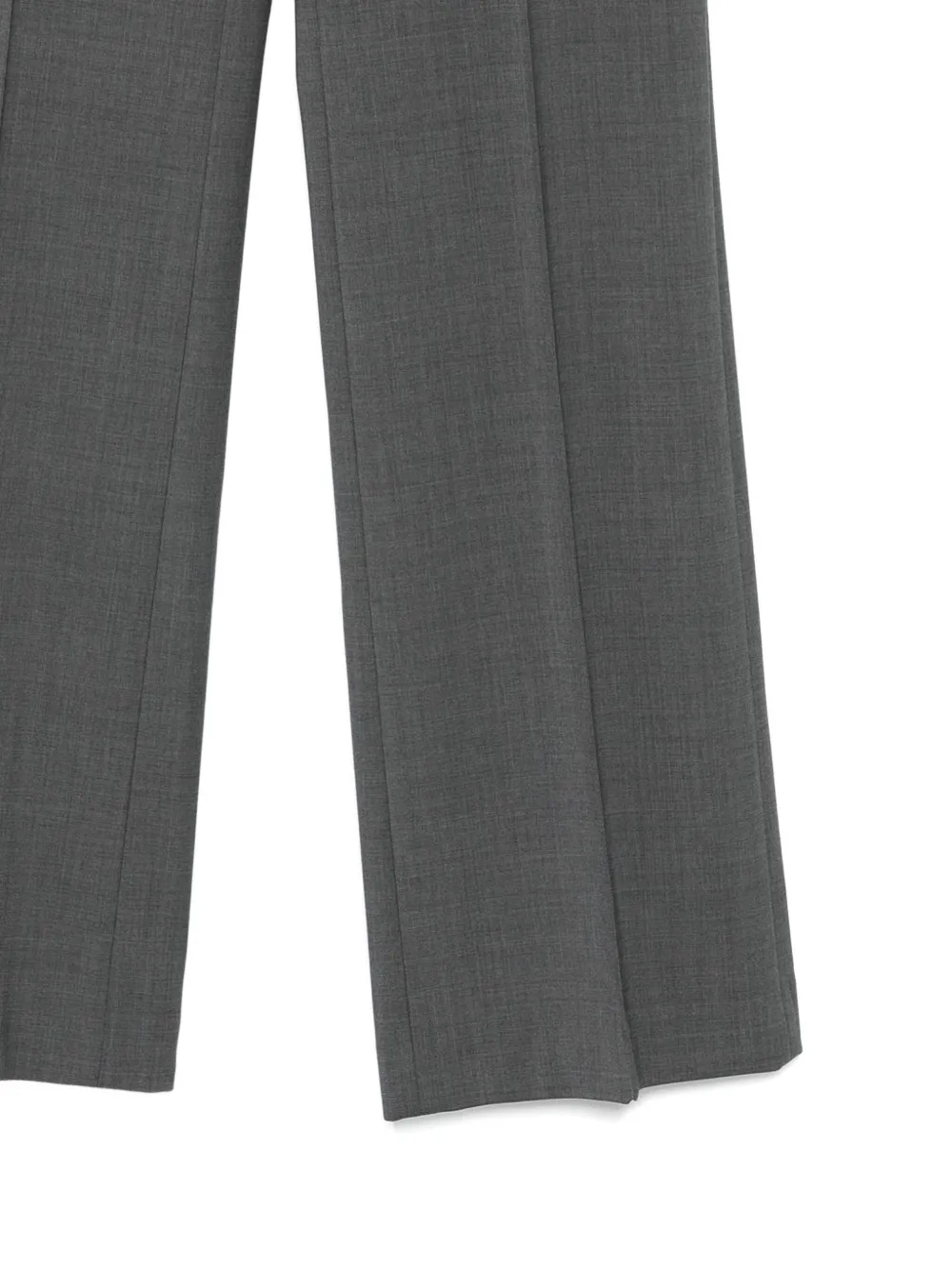 Серая шерсть, заглаженные складки, боковые карманы, приталенный фасон, потайная застежка спереди