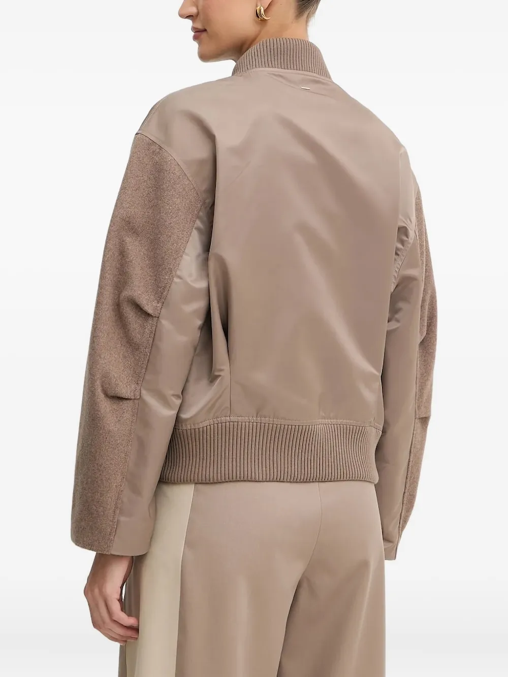 Шерстяные панели цвета тауп, атласные панели, молния спереди, ребристый подол, длинные рукава.