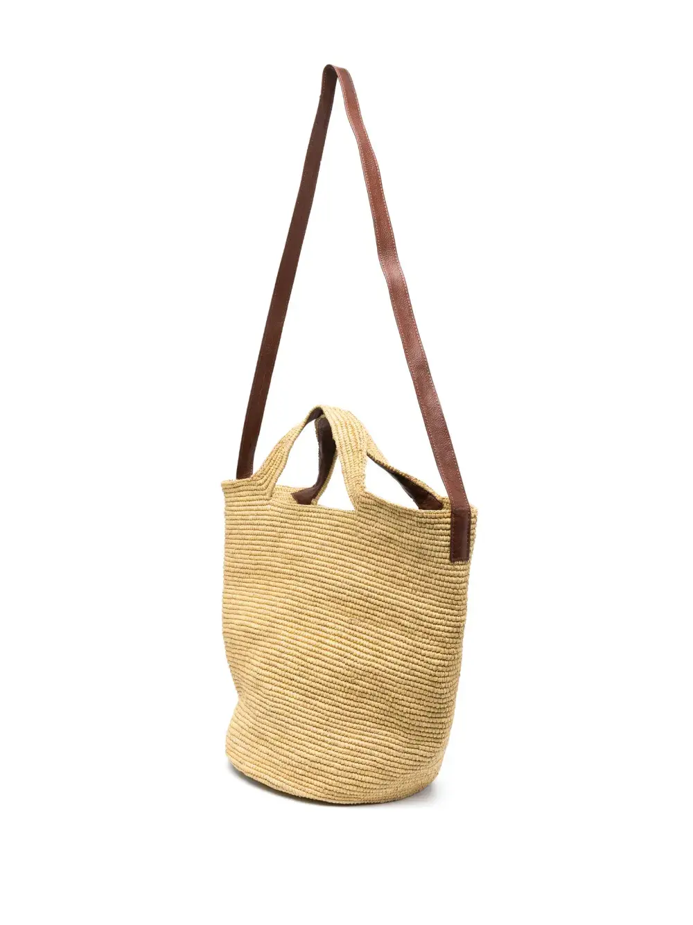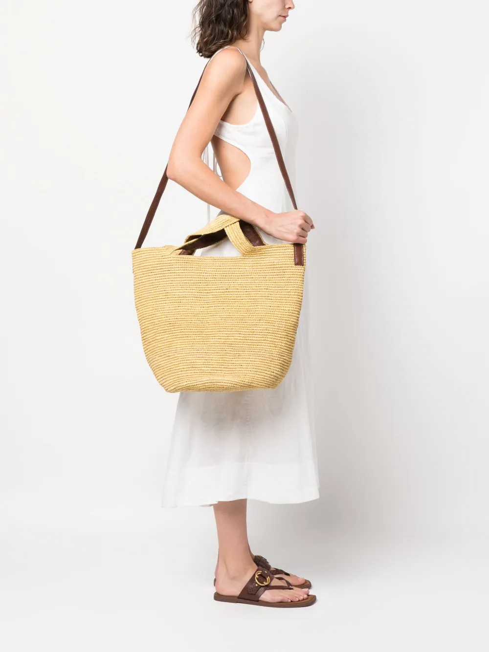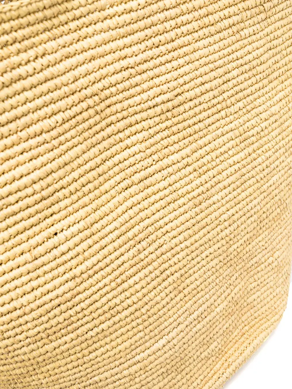 Светло-бежевый, солома, переплетенный дизайн, нашивка с логотипом внутри, ремень на плечо, дизайн с открытым верхом и основное отделение.