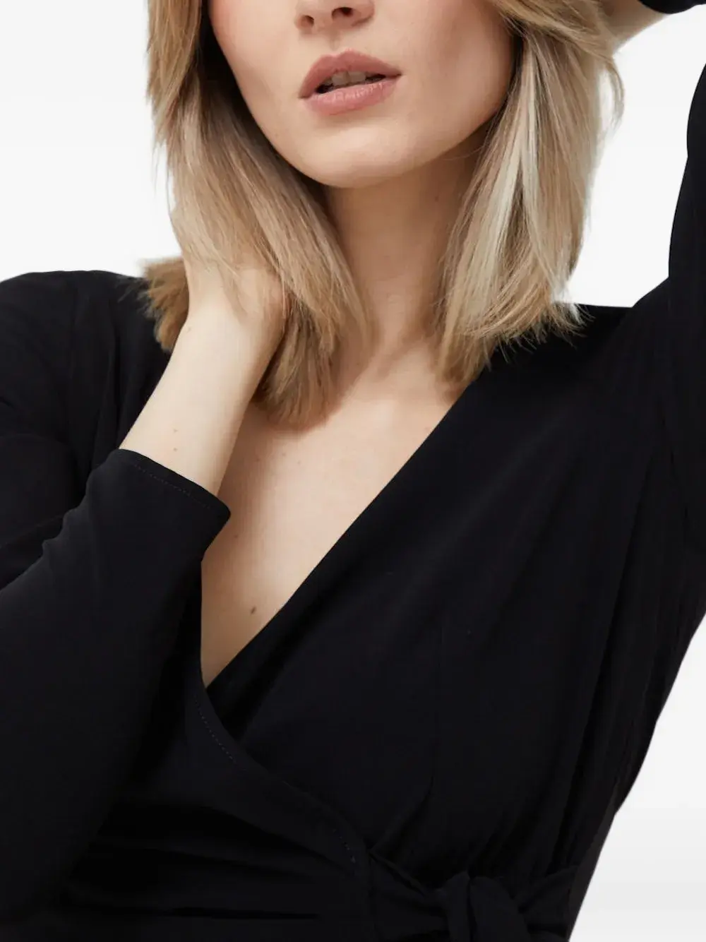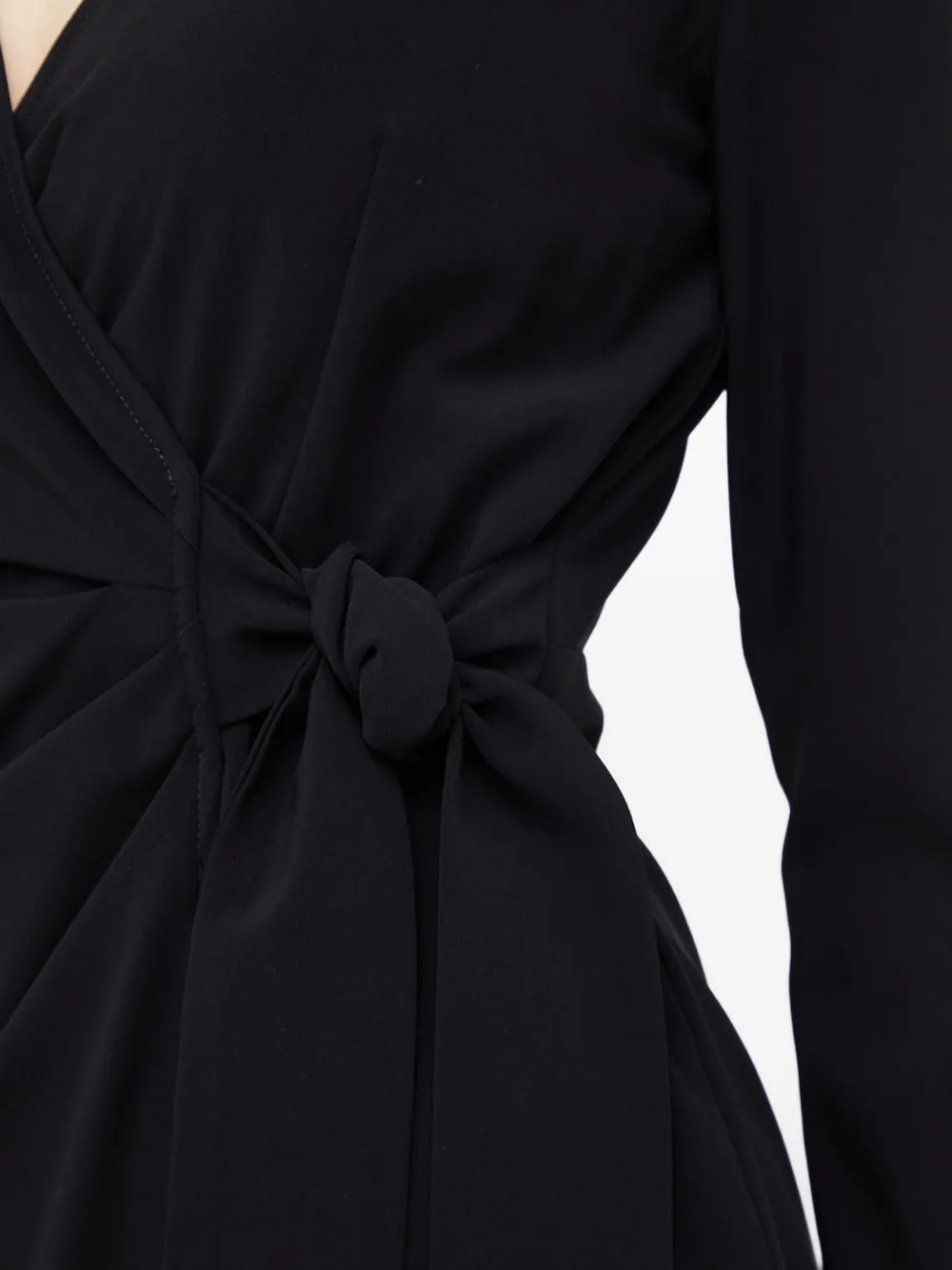 Черный топ с V-образным вырезом, длинными рукавами и завязкой.