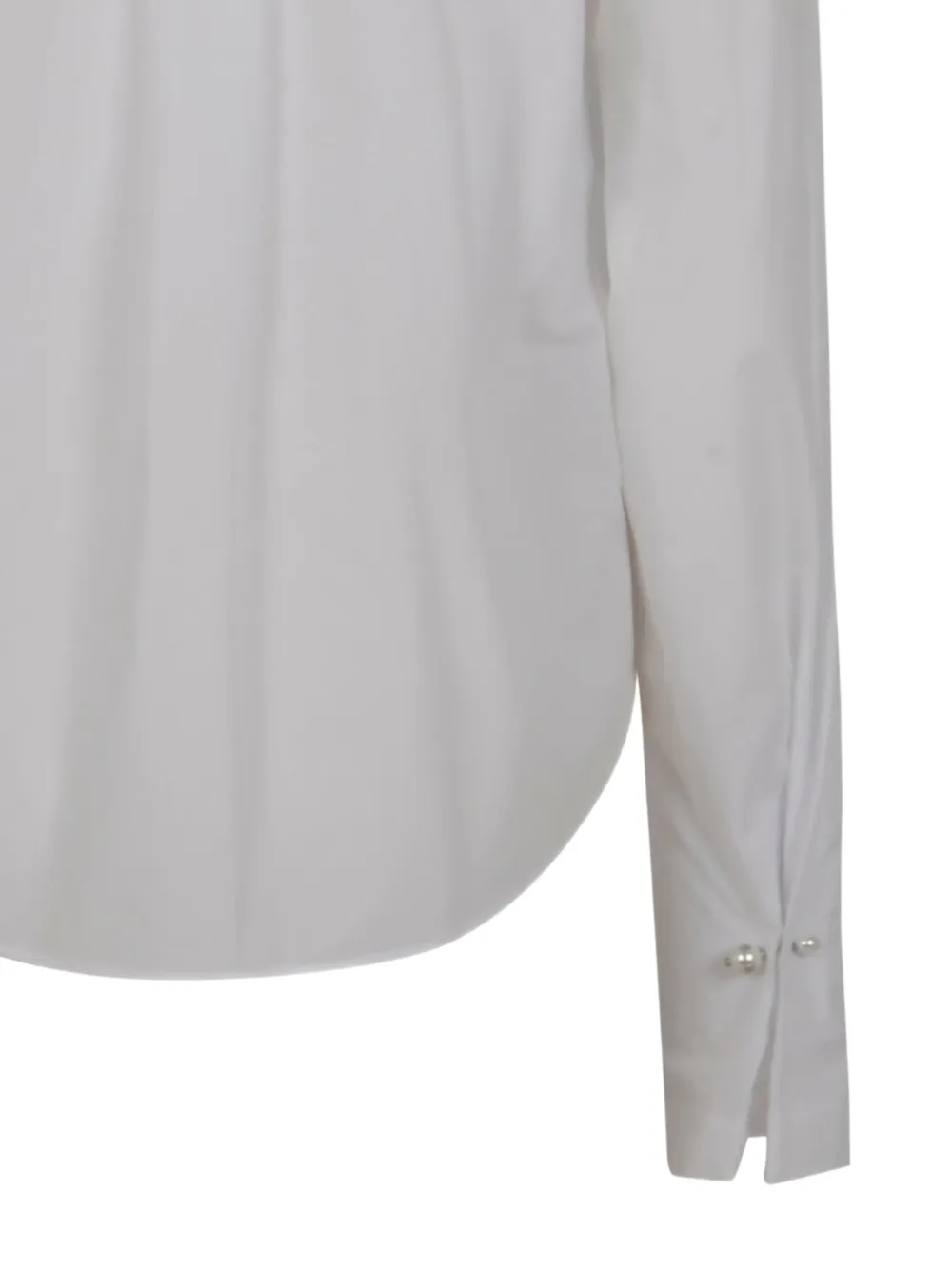 Белый перед, запах, длинные рукава, жемчужные украшения, укороченный подол, V-образный вырез.