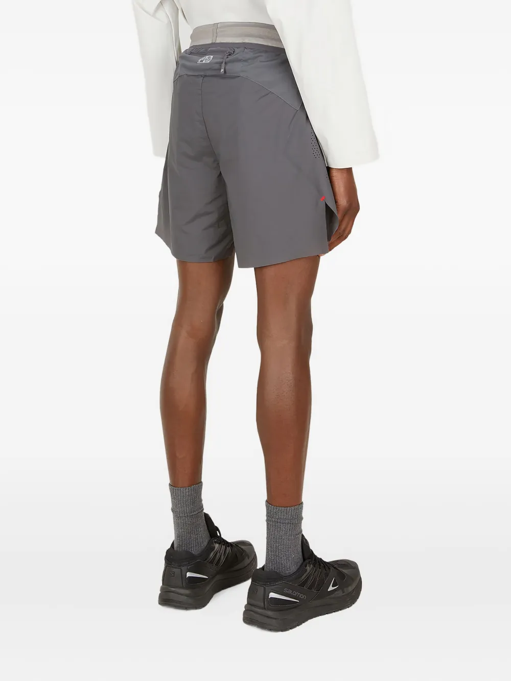 Серый эластичный пояс, перфорированные детали, боковые разрезы, небольшой логотип, прямой подол