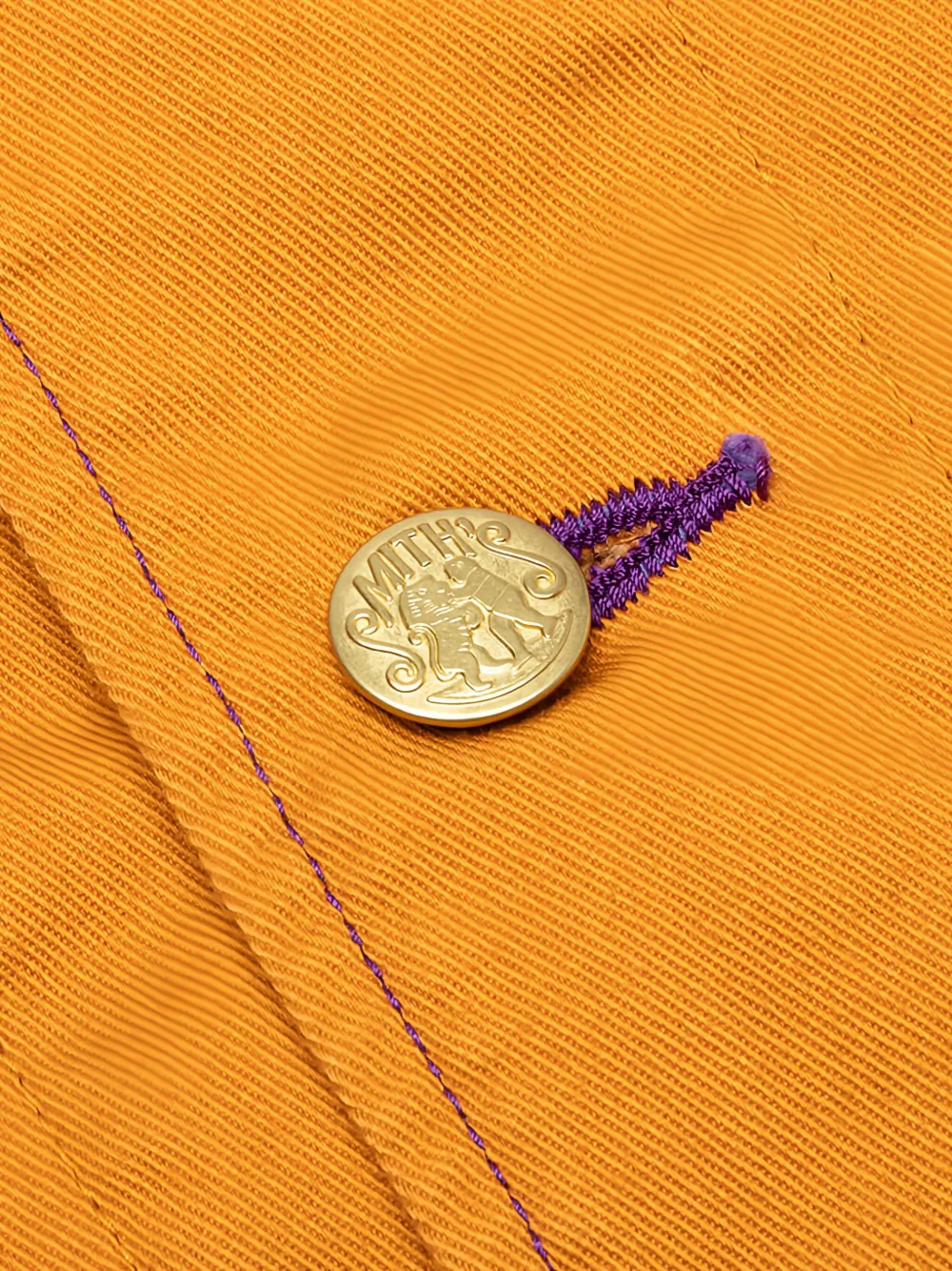 Вышитая оранжевая бабочка, золотистые пуговицы, множество карманов.